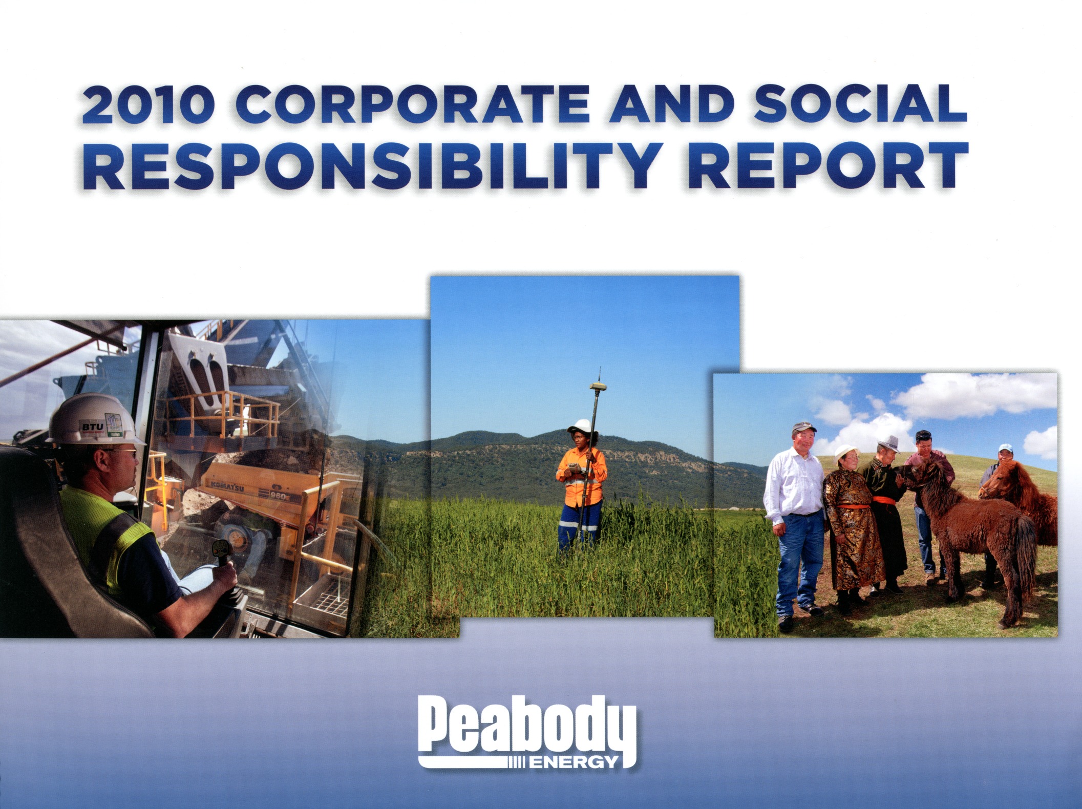 Entry Highlights: View Competition Class Performance | Company Name: | Peabody Energy  | | Company Web Site: | www.peabodyenergy.com | | Project Name: | The Peabody Energy 2010 Corporate & Social Responsibility Report | | Competition Category: | Print: CSR/Sustainability Report | | Annual Revenue: | $1+ billion | | Employee Base: | 1,000 - 10,000 Employees | | Award Garnered: | Silver | | | | Judging Results | | First Impression: | | | Overall Narrative: | | | Overall Visual Design: | | | Creativity: | | | Message Clarity: | | | Perceived Relevance: | | | Total Score: | |
