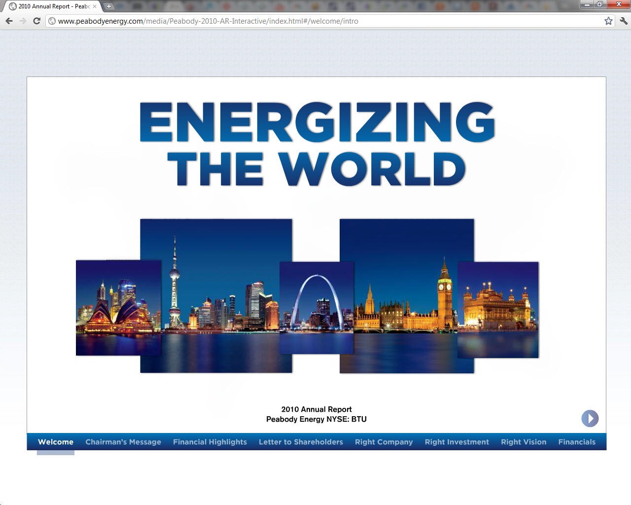 Entry Highlights: View Competition Class Performance | Company Name: | Peabody Energy  | | Company Web Site: | www.peabodyenergy.com | | Project Name: | The Peabody Energy 2010 Online Annual Report | | Competition Category: | Web/Digital: Online Report | | Annual Revenue: | $1+ billion | | Employee Base: | 1,000 - 10,000 Employees | | Award Garnered: | Silver | | | | Judging Results | | First Impression: | | | Overall Narrative: | | | Overall Visual Design: | | | Creativity: | | | Message Clarity: | | | Perceived Relevance: | | | Total Score: | |