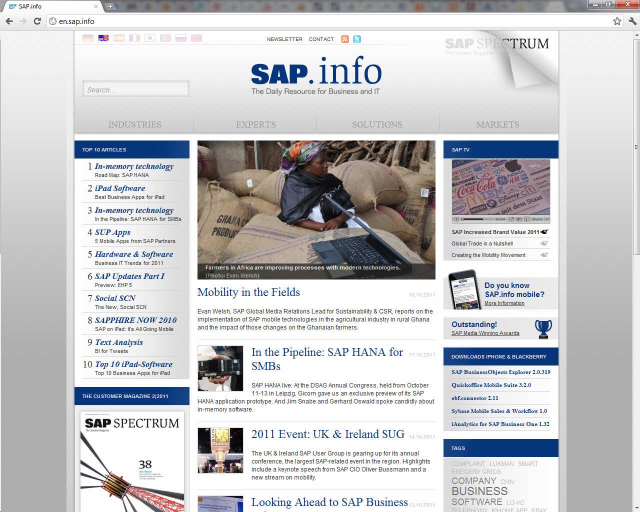 Entry Highlights: View Competition Class Performance | Company/Agency Name: | SAP AG  / grasundsterne GmbH | | Company/Agency Web Site: | www.sap.com / www.grasundsterne.de | | Project Name: | "SAP.info" | | Competition Category: | Web/Digital: Multimedia/Interactive | | Annual Revenue: | $1+ billion | | Employee Base: | 10,000+ Employees | | Award Garnered: | Silver | | | | Judging Results | | First Impression: | | | Overall Narrative: | | | Overall Visual Design: | | | Creativity: | | | Message Clarity: | | | Perceived Relevance: | | | Total Score: | |