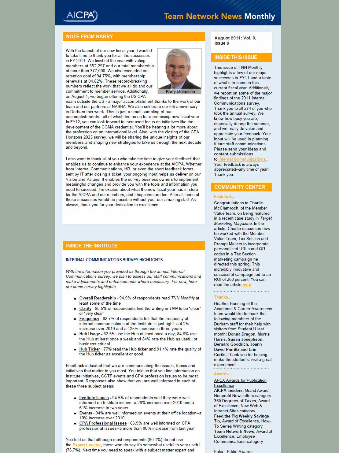 Entry Highlights: View Competition Class Performance | Company Name: | American Institute of CPAs  | | Company Web Site: | www.aicpa.org | | Project Name: | "Team Network News" | | Competition Category: | Web/Digital: Newsletter/Magazine | | Annual Revenue: | $10 - $100 million | | Employee Base: | 100 - 1,000 Employees | | Award Garnered: | Bronze | | | | Judging Results | | First Impression: | | | Overall Narrative: | | | Overall Visual Design: | | | Creativity: | | | Message Clarity: | | | Perceived Relevance: | | | Total Score: | |