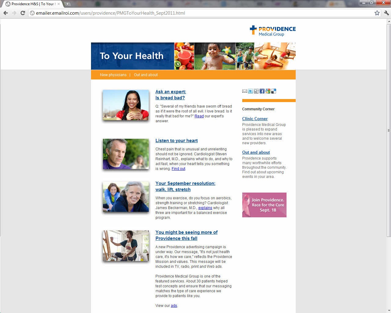 Entry Highlights: View Competition Class Performance | Company Name: | Providence Health & Services – Oregon  | | Company Web Site: | www.providence.org/oregon | | Project Name: | "To Your Health" | | Competition Category: | Web/Digital: Newsletter/Magazine | | Annual Revenue: | $1+ billion | | Employee Base: | 10,000+ Employees | | Award Garnered: | Silver | | | | Judging Results | | First Impression: | | | Overall Narrative: | | | Overall Visual Design: | | | Creativity: | | | Message Clarity: | | | Perceived Relevance: | | | Total Score: | |