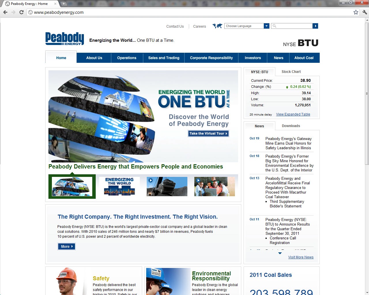 Entry Highlights: View Competition Class Performance | Company Name: | Peabody Energy  | | Company Web Site: | www.peabodyenergy.com | | Project Name: | www.peabodyenergy.com | | Competition Category: | Web/Digital: Organizational Site | | Annual Revenue: | $1+ billion | | Employee Base: | 1,000 - 10,000 Employees | | Award Garnered: | Silver | | | | Judging Results | | First Impression: | | | Overall Narrative: | | | Overall Visual Design: | | | Creativity: | | | Message Clarity: | | | Perceived Relevance: | | | Total Score: | |