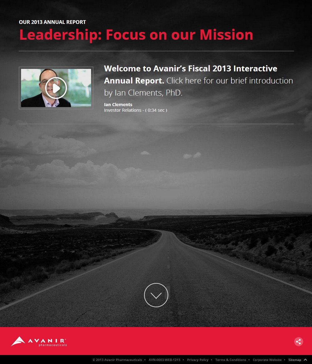 | Company/Agency Name: | Avanir Pharmaceuticals / motionstrand | | Company/Agency Web Site: | www.avanir.com / www.motionstrand.com | | Annual Revenue: | $10 - $100 million | | Employee Base: | 100 - 1,000 Employees | | Core Industry: | Pharmaceuticals | | Type of Report: | Online Annual Report | | Title/Theme: | "Leadership" | | Industry Award Garnered: | Gold | | Top 100 Worldwide Rank: | 44 | | | | Judging Results | | First Impression: | | | Report Cover: | | | Letter to Shareholders: | | | Report Narrative: | | | Report Financials: | | | Creativity: | | | Message Clarity: | | | Information Accessibility: | | | Total Score: | |