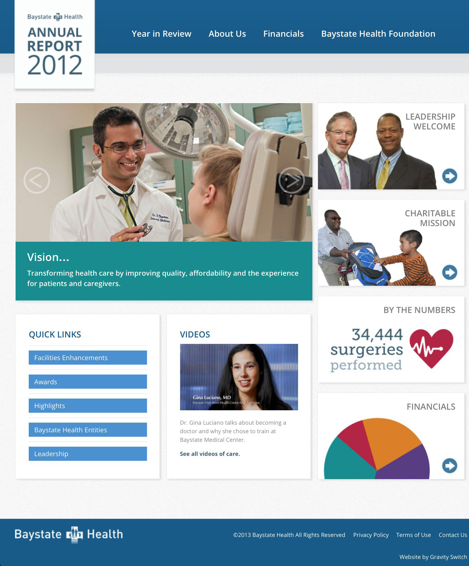 | Company/Agency Name: | Baystate Health / Gravity Switch | | Company/Agency Web Site: | www.bhannualreport.org / www.gravityswitch.com | | Annual Revenue: | $1 - $10 billion | | Employee Base: | 1,000 - 10,000 Employees | | Core Industry: | Health Care — Providers & Services | | Type of Report: | Online Annual Report | | Country-Based Honors: | Top 50 American Reports | | Industry Award Garnered: | Bronze | | | | Judging Results | | First Impression: | | | Report Cover: | | | Letter to Shareholders: | | | Report Narrative: | | | Report Financials: | | | Creativity: | | | Message Clarity: | | | Information Accessibility: | | | Total Score: | |