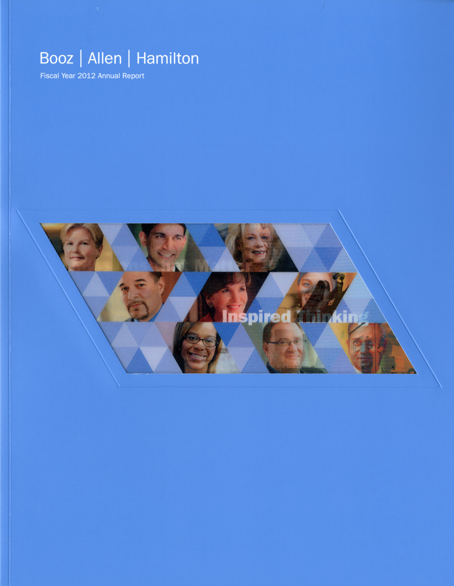 | Company/Agency Name: | Booz Allen Hamilton / BCN Communications | | Company/Agency Web Site: | www.boozallen.com / www.boozallen.com | | Annual Revenue: | $1 - $10 billion | | Employee Base: | 10,000+ Employees | | Core Industry: | Government —City/State/National | | Type of Report: | Annual Report | | Title/Theme: | "Missions that Matter. Inspired Thinking." | | Industry Award Garnered: | Silver | | | | Judging Results | | First Impression: | | | Report Cover: | | | Letter to Shareholders: | | | Report Narrative: | | | Report Financials: | | | Creativity: | | | Message Clarity: | | | Information Accessibility: | | | Total Score: | |