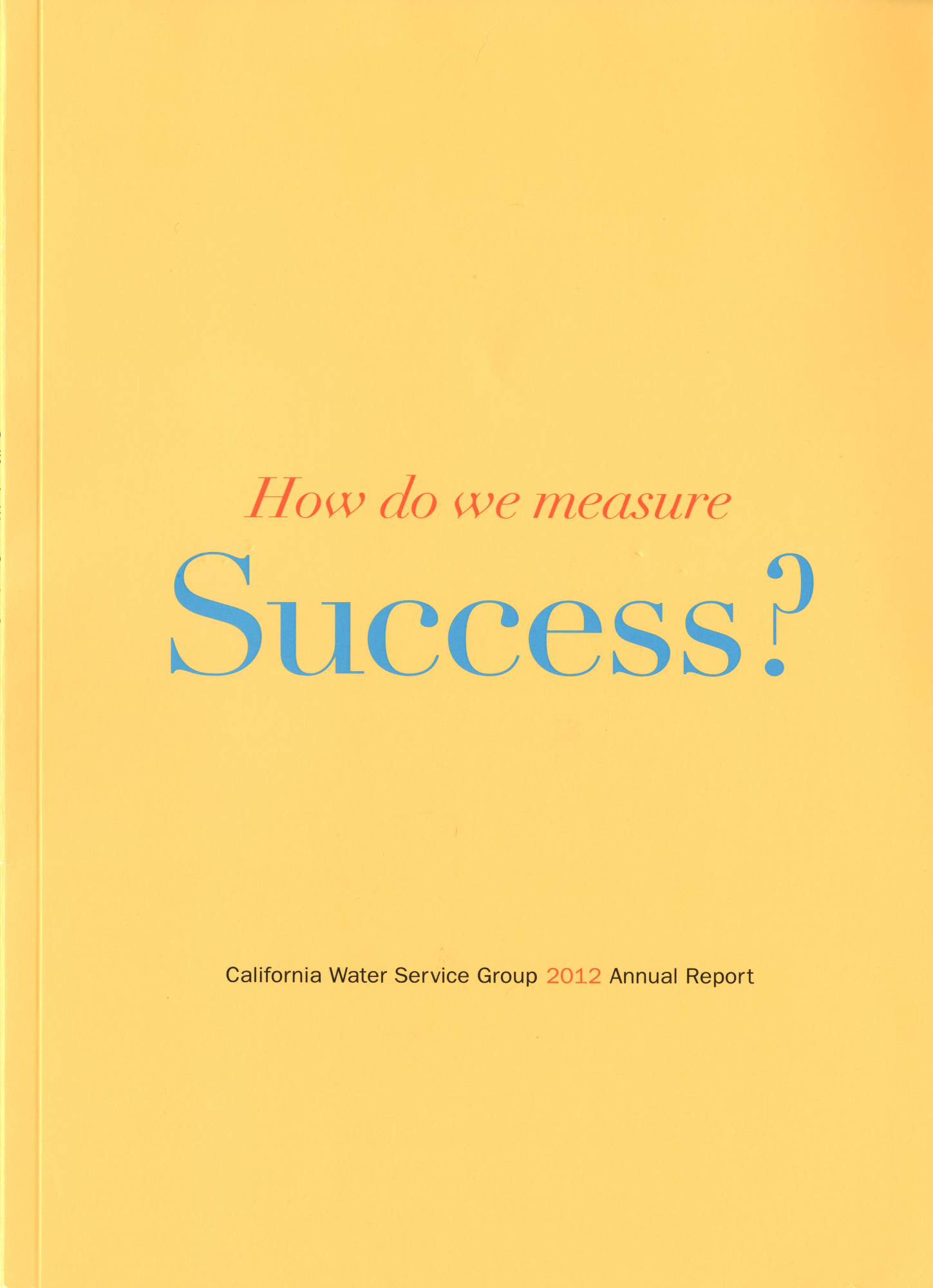 | Company Name: | California Water Service Company  | | Company Web Site: | www.calwater.com | | Annual Revenue: | $100 million - $1 billion | | Employee Base: | 100 - 1,000 Employees | | Core Industry: | Utilities — Multi/Water/Traders | | Type of Report: | Annual Report | | Title/Theme: | "How do we measure Success?" | | Industry Award Garnered: | Silver | | | | Judging Results | | First Impression: | | | Report Cover: | | | Letter to Shareholders: | | | Report Narrative: | | | Report Financials: | | | Creativity: | | | Message Clarity: | | | Information Accessibility: | | | Total Score: | |