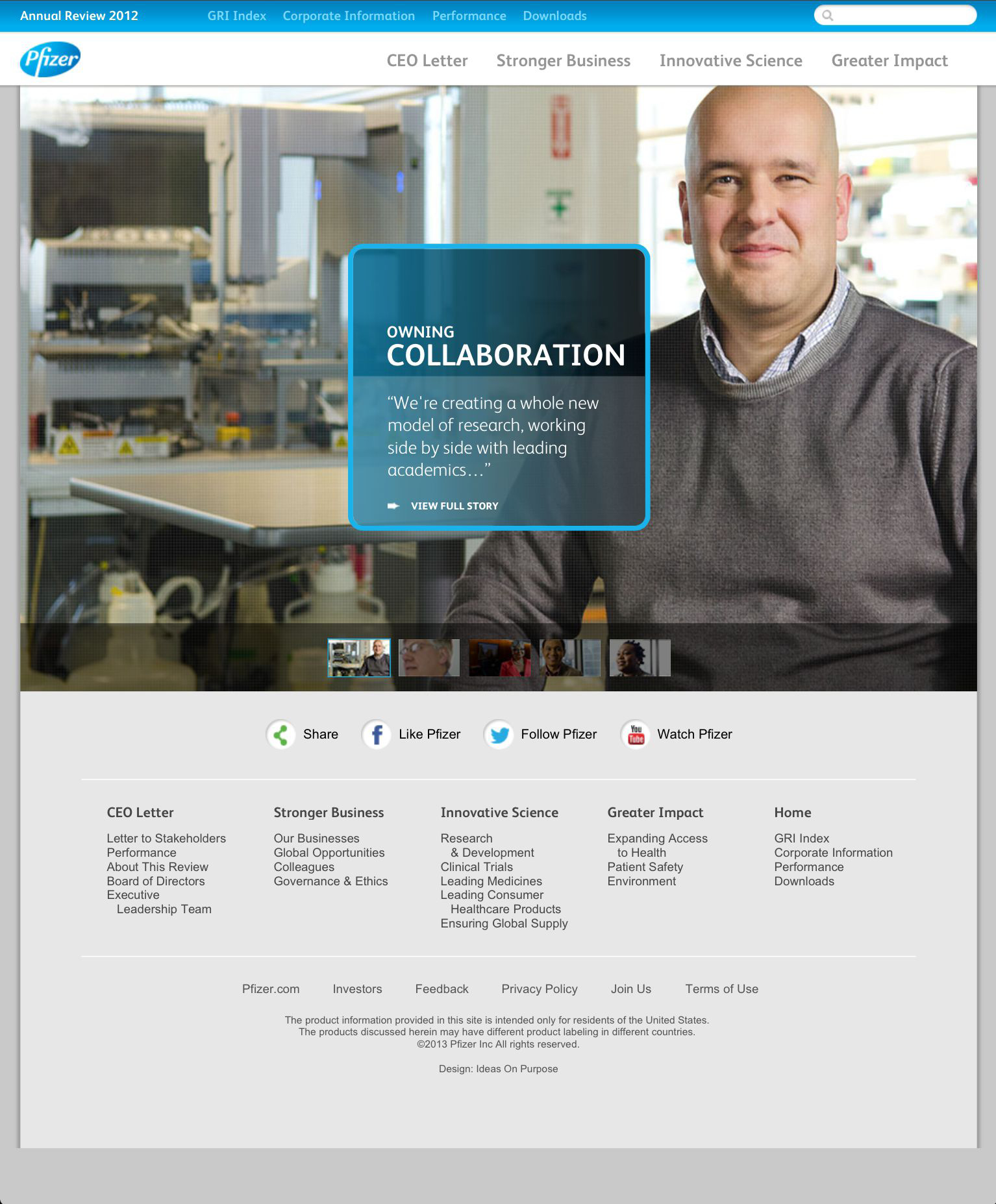 | Company/Agency Name: | Pfizer / Ideas On Purpose | | Annual Revenue: | $10+ billion | | Employee Base: | 10,000+ Employees | | Core Industry: | Pharmaceuticals | | Type of Report: | Online Annual Report | | Title/Theme: | "Owning Collaboration, Trust and Potential" | | Country-Based Honors: | Top 50 American Reports | | Industry Award Garnered: | Silver | | | | Judging Results | | First Impression: | | | Report Cover: | | | Letter to Shareholders: | | | Report Narrative: | | | Report Financials: | | | Creativity: | | | Message Clarity: | | | Information Accessibility: | | | Total Score: | |