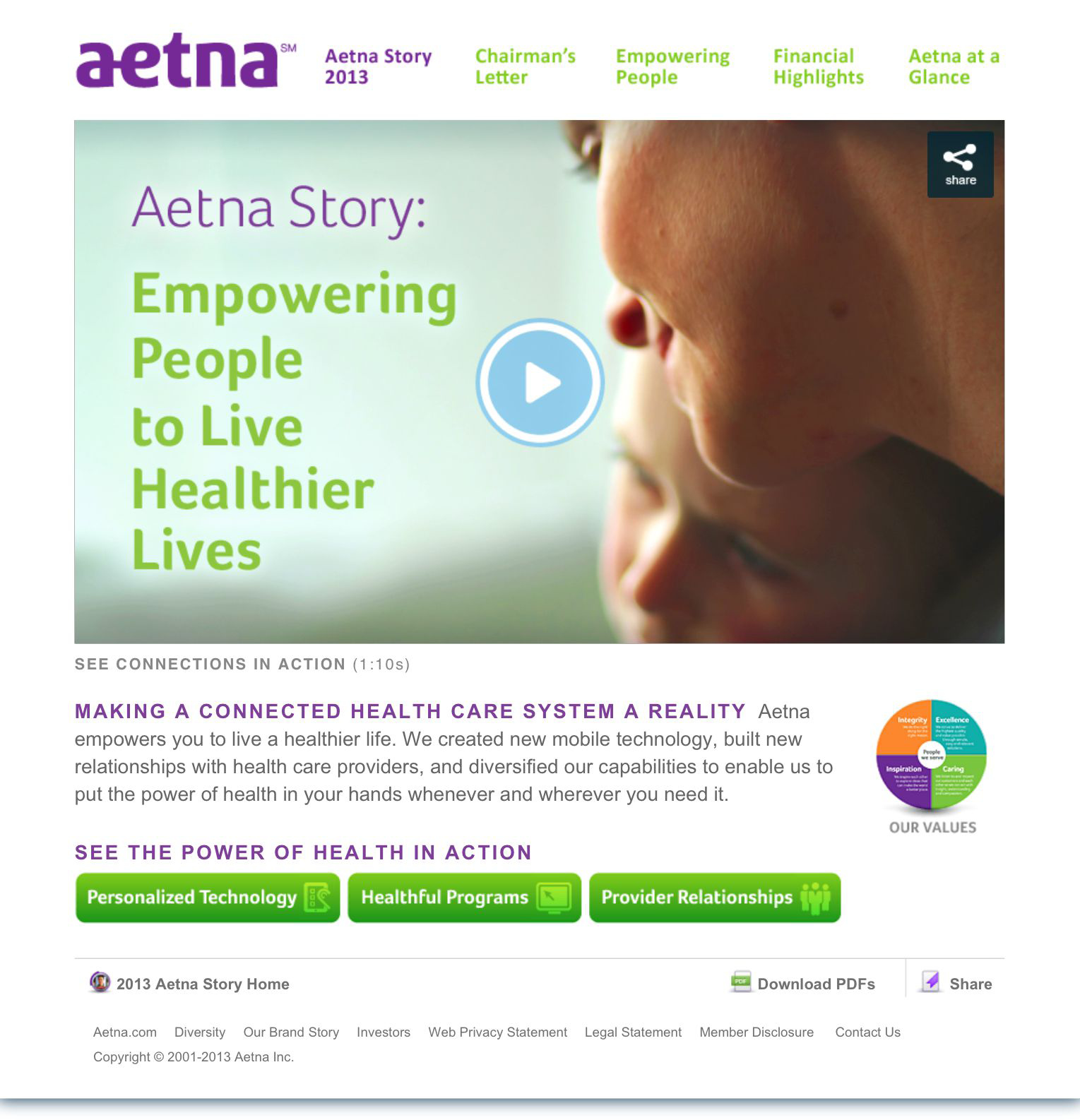 | Company Name: | Aetna  | | Company Web Site: | www.aetnastory.com | | Annual Revenue: | $10+ billion | | Employee Base: | 10,000+ Employees | | Core Industry: | Health Care — Providers & Services | | Type of Report: | Online Annual Report | | Regional Top 50 Rank: | 7 (Americas Region) | | Country-Based Honors: | Top 50 American Reports | | Industry Award Garnered: | Platinum | | Top 100 Worldwide Rank: | 44 | | | | Judging Results | | First Impression: | | | Report Cover: | | | Letter to Shareholders: | | | Report Narrative: | | | Report Financials: | | | Creativity: | | | Message Clarity: | | | Information Accessibility: | | | Total Score: | |