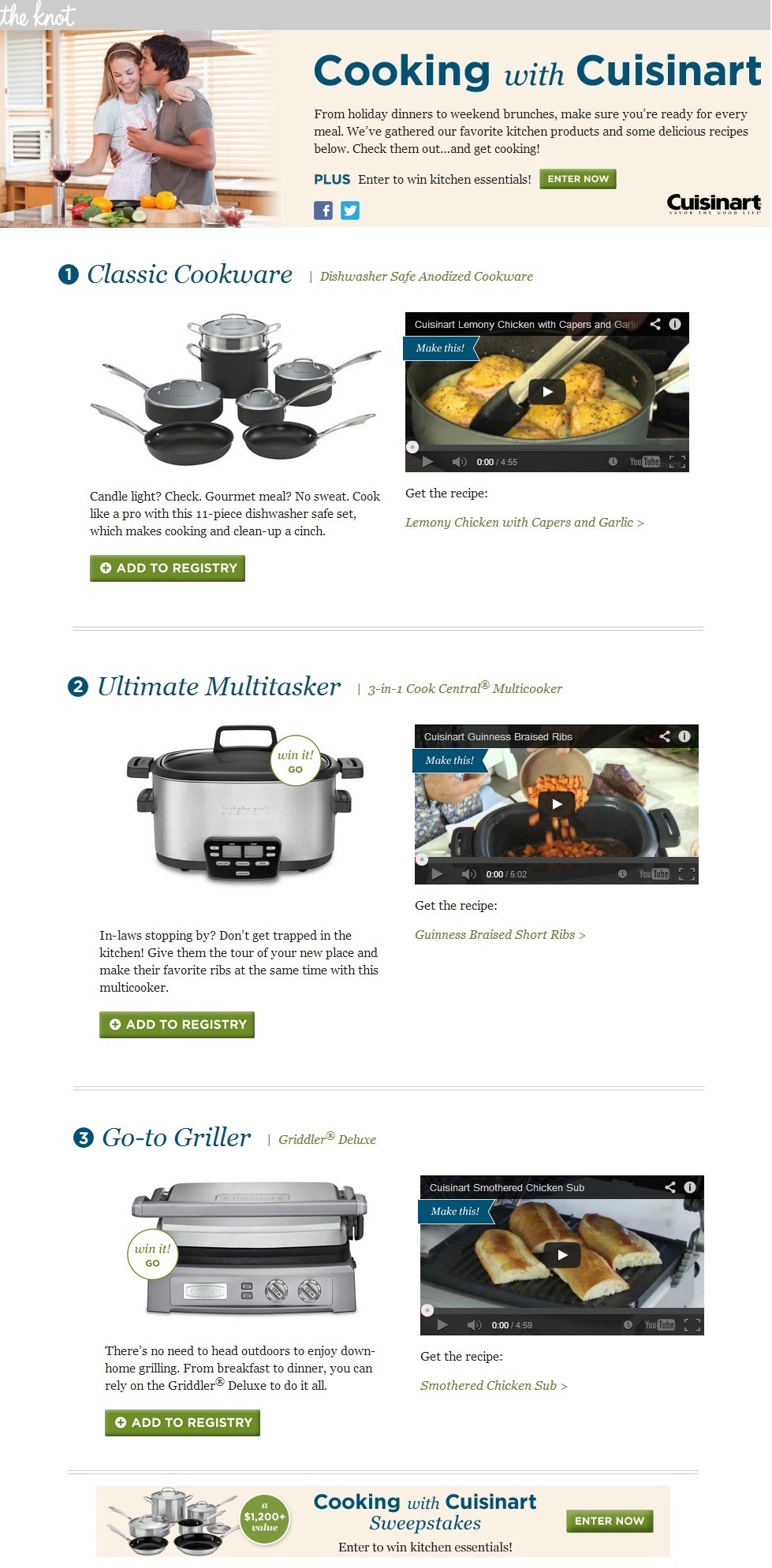 Entry Highlights: View Competition Class Performance | Company Name: | Cuisinart  | | Company Web Site: | www.cuisinart.com | | Project Name: | Cuisinart's Digital & Mobile Bridal Marketing Hub | | Competition Category: | Web/E-Mail: Multimedia/Interactive | | Annual Revenue: | $10 - $100 million | | Employee Base: | 1,000 - 10,000 Employees | | Award Garnered: | Gold | | | | Judging Results | | First Impression: | | | Overall Narrative: | | | Overall Visual Design: | | | Creativity: | | | Message Clarity: | | | Perceived Relevance: | | | Total Score: | |