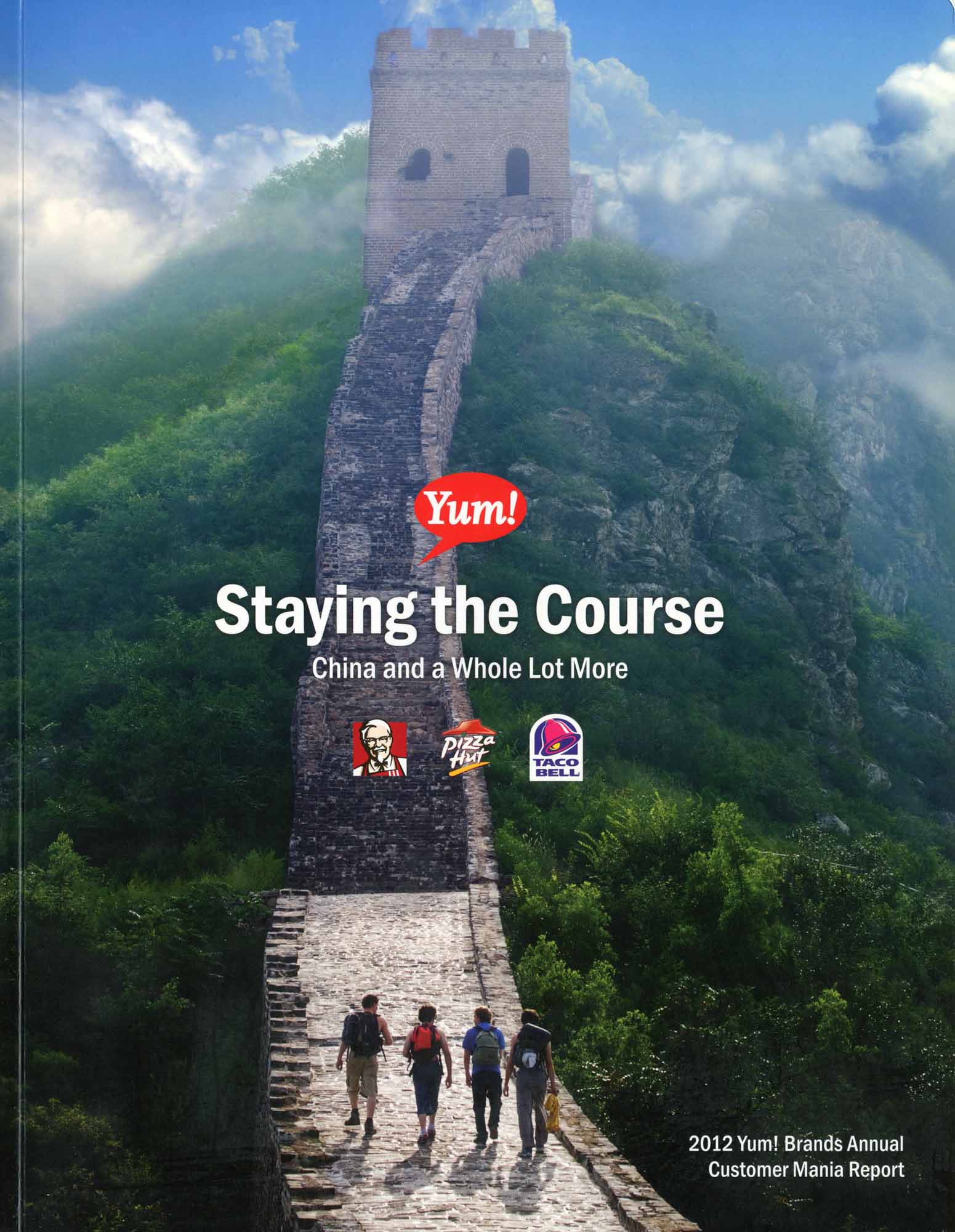 Entry Highlights: View Competition Class Performance | Company Name: | Yum! Brands, Inc.  | | Company Web Site: | www.yum.com | | Project Name: | The 2012 Yum! Brands Customer Mania Report | | Competition Category: | Print: Annual Report | | Annual Revenue: | $10+ billion | | Employee Base: | 10,000+ Employees | | Award Garnered: | Bronze | | | | Judging Results | | First Impression: | | | Overall Narrative: | | | Overall Visual Design: | | | Creativity: | | | Message Clarity: | | | Perceived Relevance: | | | Total Score: | |