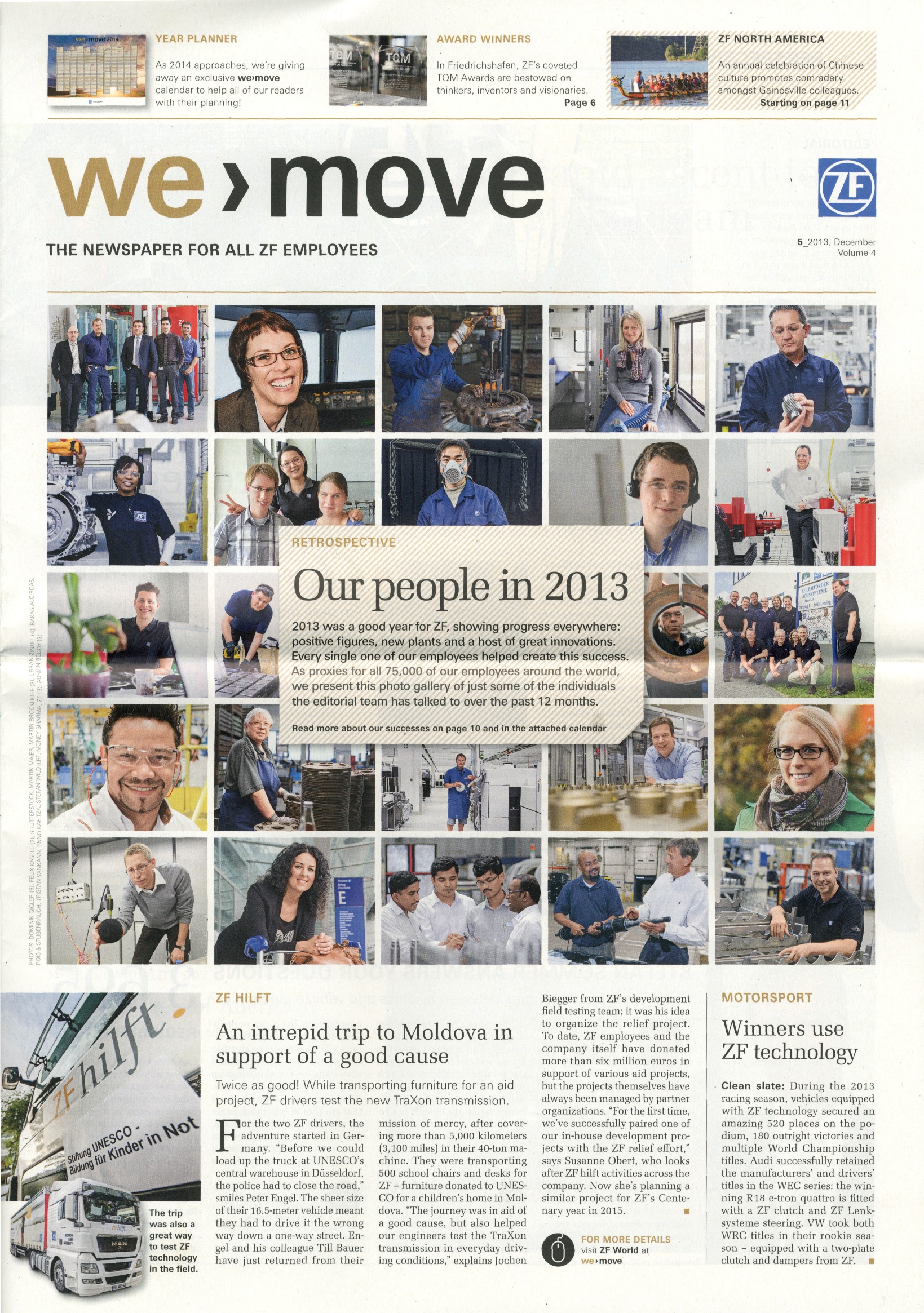 Entry Highlights: View Competition Class Performance | Company/Agency Name: | ZF Friedrichshafen AG  / HOFFMANN UND CAMPE Corporate Publishing | | Company/Agency Web Site: | www.zf.com / www.hocacp.de | | Project Name: | "we>move" | | Competition Category: | Print: Magazine/Newsletter | | Annual Revenue: | $10+ billion | | Employee Base: | 10,000+ Employees | | Award Garnered: | Silver | | | | Judging Results | | First Impression: | | | Overall Narrative: | | | Overall Visual Design: | | | Creativity: | | | Message Clarity: | | | Perceived Relevance: | | | Total Score: | |