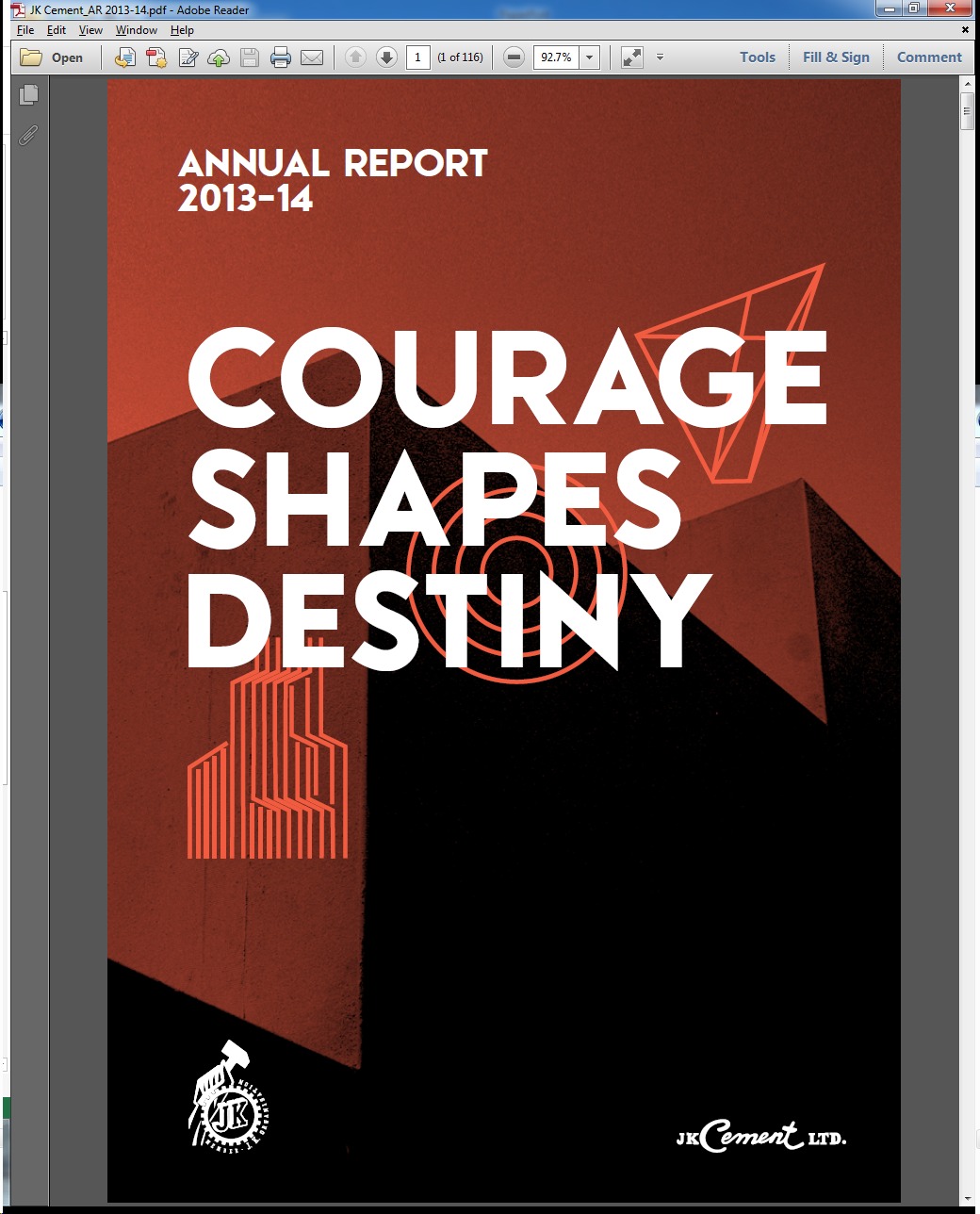 | Company/Agency Name: | JK Cement Ltd / AICL Communications Limited | | Company/Agency Web Site: | www.jkcement.com. / www.aicl.in | | Annual Revenue: | $100 million - $1 billion | | Employee Base: | 1,000 - 10,000 Employees | | Core Industry: | Materials | | Type of Report: | Annual Report | | Title/Theme: | "Courage Shapes Destiny" | | Industry Award Garnered: | Platinum | | Top 50 Worldwide Rank: | 16 | | | | Judging Results | | First Impression: | | | Report Cover: | | | Letter to Shareholders: | | | Report Narrative: | | | Report Financials: | | | Creativity: | | | Message Clarity: | | | Information Accessibility: | | | Total Score: | |