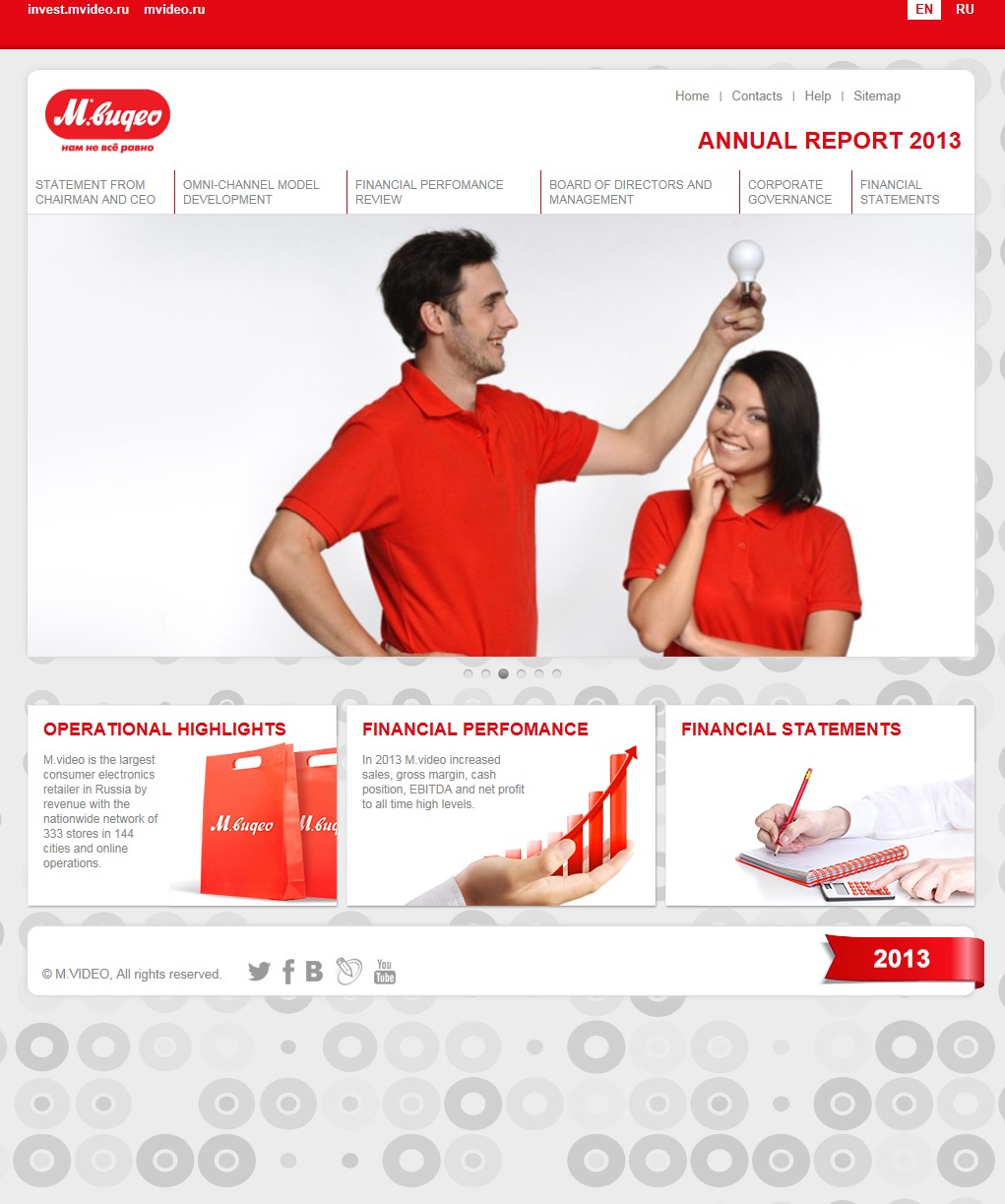 | Company/Agency Name: | M.video / EQS Group | | Company/Agency Web Site: | mvideo.ru / eqs.com | | Annual Revenue: | $1 - $10 billion | | Employee Base: | 10,000+ Employees | | Core Industry: | Retailing -- Multi-line Retail | | Type of Report: | Online Annual Report | | Industry Award Garnered: | Gold | | | | Judging Results | | First Impression: | | | Report Cover: | | | Letter to Shareholders: | | | Report Narrative: | | | Report Financials: | | | Creativity: | | | Message Clarity: | | | Information Accessibility: | | | Total Score: | |