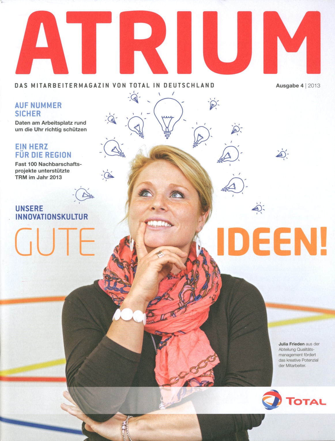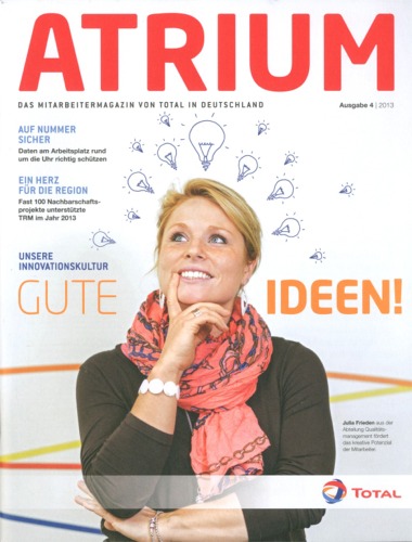 | Company/Agency Name: | Total Deutschland GmbH  / muehlhausmoers corporate communications | | Company/Agency Web Site: | www.total.de / www.muehlhausmoers.de | | Annual Revenue: | $100 million - $1 billion | | Employee Base: | 1,000 - 10,000 Employees | | Publication/Project Name: | "Atrium" | | Publication Format: | Print | Monthly | | Primary Audience: | Employees | | Award Garnered: | Bronze | | | | Judging Results | | First Impression: | | | Artwork: | | | Readability: | | | Creativity: | | | Message Clarity: | | | Variety of Features: | | | Audience Focus: | | | Perceived Relevance: | | | Ease of Navigation: | | | Total Score: | |