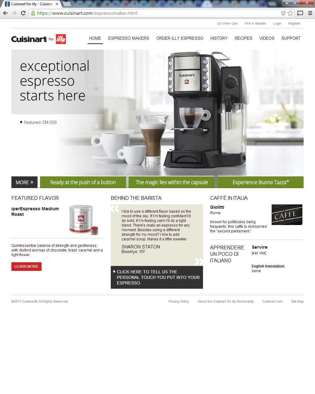 Entry Highlights: View Competition Class Performance | Company Name: | Cuisinart  | | Company Web Site: | www.cuisinart.com | | Project Name: | "Cuisinart for illy" Dedicated Microsite | | Competition Category: | Digital: Multimedia/Interactive | | Annual Revenue: | $1+ billion | | Employee Base: | 1,000 - 10,000 Employees | | Award Garnered: | Silver | | | | Judging Results | | First Impression: | | | Overall Narrative: | | | Overall Visual Design: | | | Creativity: | | | Message Clarity: | | | Perceived Relevance: | | | Total Score: | |