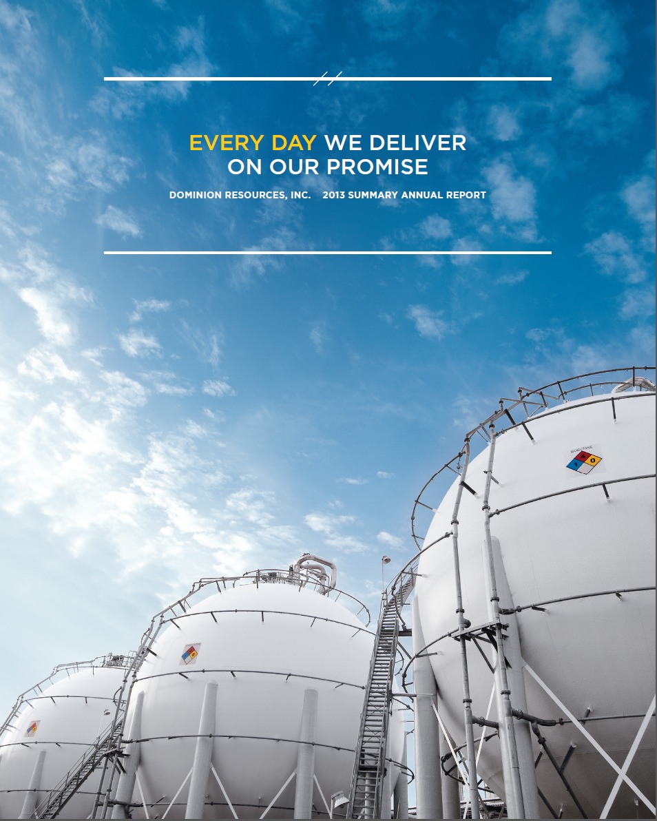 | Company/Agency Name: | Dominion Resources, Inc. / Ideas On Purpose | | Company/Agency Web Site: | www.dom.com / www.ideasonpurpose.com | | Annual Revenue: | $100 million - $1 billion | | Employee Base: | 1,000 - 10,000 Employees | | Core Industry: | Energy – Equipment & Services | | Type of Report: | Annual Report | | Title/Theme: | "Anywhere" | | Regional Top 80 Rank: | 53 (Americas Region) | | Country-Based Honors: | Top 50 American Reports | | Industry Award Garnered: | Gold | | | | Judging Results | | First Impression: | | | Report Cover: | | | Letter to Shareholders: | | | Report Narrative: | | | Report Financials: | | | Creativity: | | | Message Clarity: | | | Information Accessibility: | | | Total Score: | |