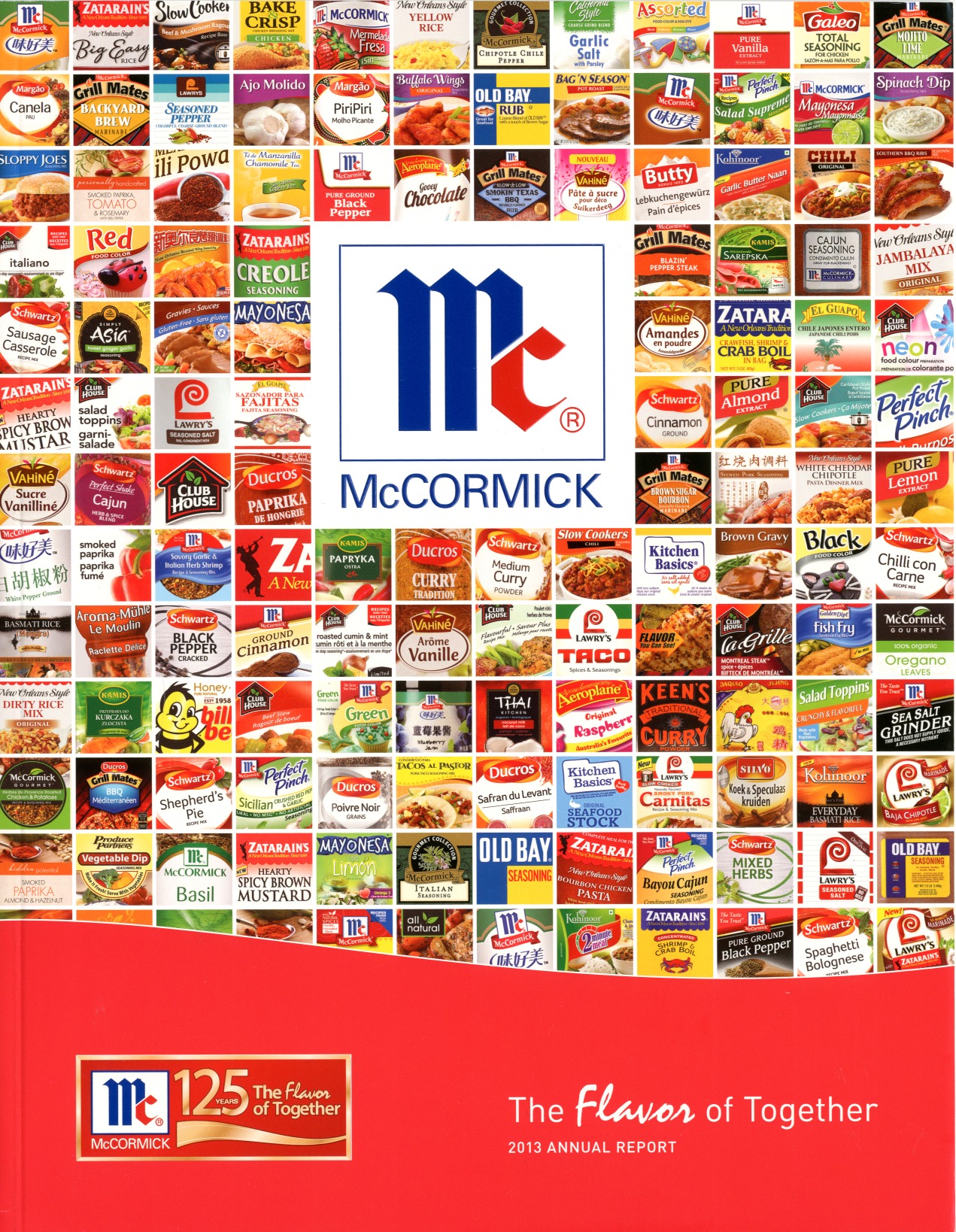| Company/Agency Name: | McCormick & Co. / Curran & Connors | | Company Web Site: | ir.mccormick.com | | Annual Revenue: | $1 - $10 billion | | Employee Base: | 10,000+ Employees | | Core Industry: | Consumer Consumables – Food/Beverages/Tobacco | | Type of Report: | Annual Report | | Title/Theme: | "The Flavor of Together" – 125th Anniversary | | Industry Award Garnered: | Bronze | | | | Judging Results | | First Impression: | | | Report Cover: | | | Letter to Shareholders: | | | Report Narrative: | | | Report Financials: | | | Creativity: | | | Message Clarity: | | | Information Accessibility: | | | Total Score: | |
