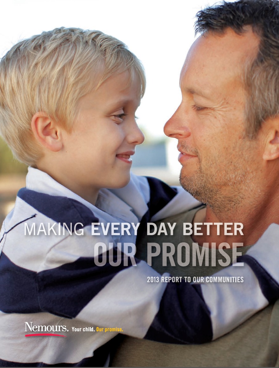 | Company/Agency Name: | Nemours / ruckus. advertising + public relations | | Company/Agency Web Site: | www.nemours.org / www.createaruckus.com | | Annual Revenue: | $100 million - $1 billion | | Employee Base: | 1,000 - 10,000 Employees | | Core Industry: | Health Care – Providers & Services | | Type of Report: | Annual Report | | Industry Award Garnered: | Silver | | | | Judging Results | | First Impression: | | | Report Cover: | | | Letter to Shareholders: | | | Report Narrative: | | | Report Financials: | | | Creativity: | | | Message Clarity: | | | Information Accessibility: | | | Total Score: | |