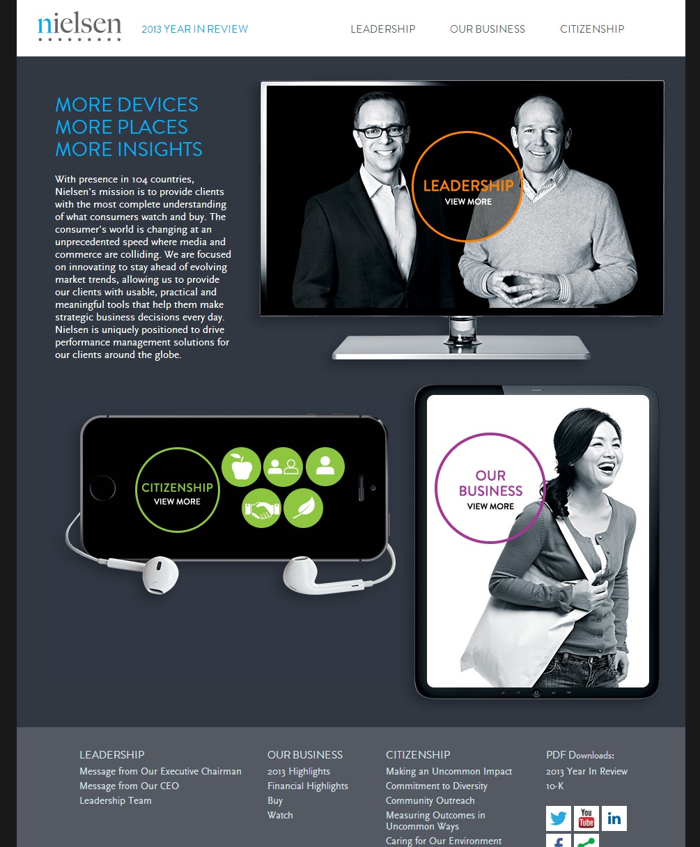 | Company/Agency Name: | Nielsen / Ideas On Purpose | | Company/Agency Web Site: | www.nielsen.com / www.ideasonpurpose.com | | Annual Revenue: | $100 million - $1 billion | | Employee Base: | 1,000 - 10,000 Employees | | Core Industry: | Business Services | | Type of Report: | Online/Digital Report | | Title/Theme: | "More Devices, More Places, More Insights" | | Regional Top 80 Rank: | 49 (Americas Region) | | Country-Based Honors: | Top 50 American Reports | | Industry Award Garnered: | Gold | | | | Judging Results | | First Impression: | | | Report Cover: | | | Letter to Shareholders: | | | Report Narrative: | | | Report Financials: | | | Creativity: | | | Message Clarity: | | | Information Accessibility: | | | Total Score: | |
