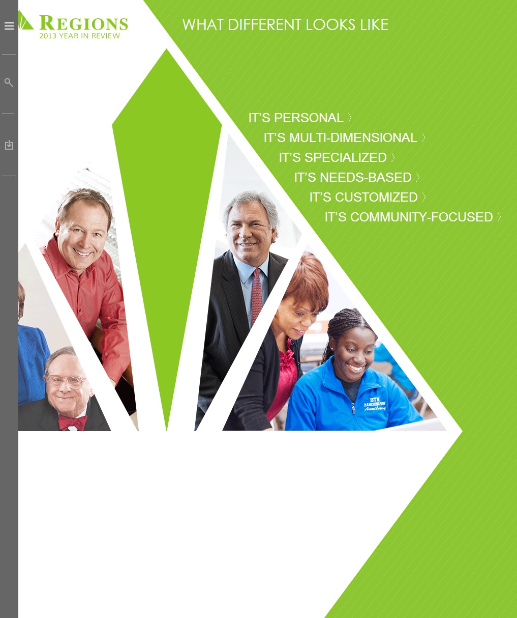 | Company/Agency Name: | Regions Financial / Corporate Reports, Inc. | | Company/Agency Web Site: | www.regions.com / www.corporatereport.com | | Annual Revenue: | $1 - $10 billion | | Employee Base: | 1,000 - 10,000 Employees | | Core Industry: | Banks – Commercial | | Type of Report: | Online/Digital Report | | Title/Theme: | The Regions 2013 Annual Review – "What Different Looks Like" | | Regional Top 80 Rank: | 10 (Americas Region) | | Country-Based Honors: | Top 50 American Reports | | Industry Award Garnered: | Platinum | | Top 100 Worldwide Rank: | 41 | | | | Judging Results | | First Impression: | | | Report Cover: | | | Letter to Shareholders: | | | Report Narrative: | | | Report Financials: | | | Creativity: | | | Message Clarity: | | | Information Accessibility: | | | Total Score: | |