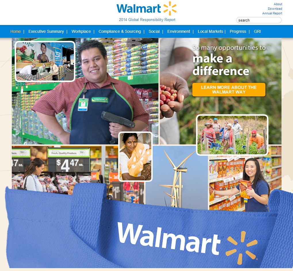 | Company/Agency Name: | Wal-Mart Stores, Inc. / Corporate Reports, Inc. | | Company/Agency Web Site: | www.corporate.walmart.com / www.corporatereport.com | | Annual Revenue: | $10+ billion | | Employee Base: | 10,000+ Employees | | Core Industry: | Retailing – Multi-line Retail | | Type of Report: | CSR/Corporate Responsibility Report | | Title/Theme: | The Walmart 2014 Global Responsibility Report – "So Many Opportunities to Make a Difference" | | Regional Top 80 Rank: | 8 (Americas Region) | | Country-Based Honors: | Top 50 American Reports | | Industry Award Garnered: | Platinum | | Top 100 Worldwide Rank: | 39 | | | | Judging Results | | First Impression: | | | Report Cover: | | | Letter to Shareholders: | | | Report Narrative: | | | Report Financials: | | | Creativity: | | | Message Clarity: | | | Information Accessibility: | | | Total Score: | |