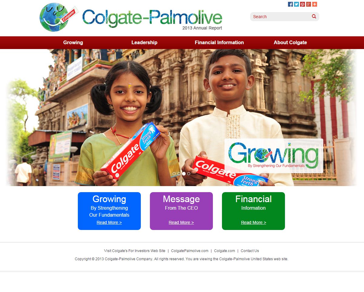 Entry Highlights: View Competition Class Performance | Company Name: | Colgate-Palmolive  | | Company Web Site: | www.colgatepalmolive.com | | Project Name: | The Colgate-Palmolive Company 2013 Annual Report | | Competition Category: | Digital: Web/Intranet Site (List Under 'Special Instructions') | | Annual Revenue: | $10+ billion | | Employee Base: | 10,000+ Employees | | Award Garnered: | Gold | | | | Judging Results | | First Impression: | | | Overall Narrative: | | | Overall Visual Design: | | | Creativity: | | | Message Clarity: | | | Perceived Relevance: | | | Total Score: | |