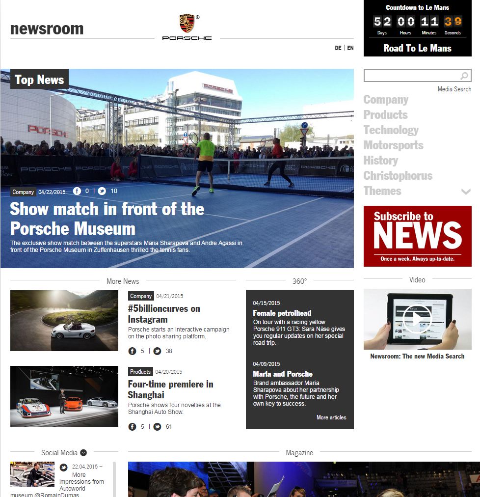 Entry Highlights: View Competition Class Performance | Company/Agency Name: | Dr. Ing. h.c. F. Porsche AG  / C3 Creative Code and Content GmbH | | Company/Agency Web Site: | www.porsche.com / www.c3.co | | Project Name: | "Porsche Newsroom" | | Competition Category: | Digital: Web/Intranet Site (List Under 'Special Instructions') | | Annual Revenue: | $10+ billion | | Employee Base: | 10,000+ Employees | | Award Garnered: | Platinum | | Top 40 Rank: | 4 | | | | Judging Results | | First Impression: | | | Overall Narrative: | | | Overall Visual Design: | | | Creativity: | | | Message Clarity: | | | Perceived Relevance: | | | Total Score: | |
