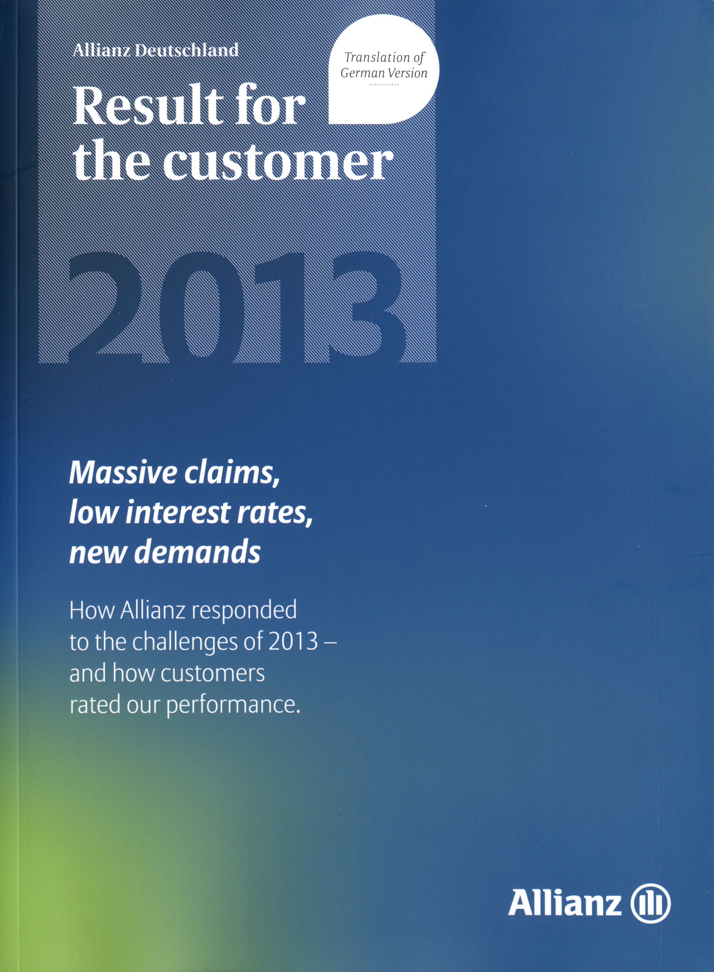 Entry Highlights: View Competition Class Performance | Company/Agency Name: | Allianz Deutschland GmbH  / KircherBurkhardt GmbH | | Company/Agency Web Site: | www.allianz.de / www.kircher-burkhardt.com | | Project Name: | "Allianz Result for the Customer" (Print Edition) | | Competition Category: | Print: Annual Report | | Annual Revenue: | $1 - $10 billion | | Employee Base: | 10,000+ Employees | | Award Garnered: | Platinum | | Top 100 Rank: | 6 | | | | Judging Results | | First Impression: | | | Overall Narrative: | | | Overall Visual Design: | | | Creativity: | | | Message Clarity: | | | Perceived Relevance: | | | Total Score: | |
