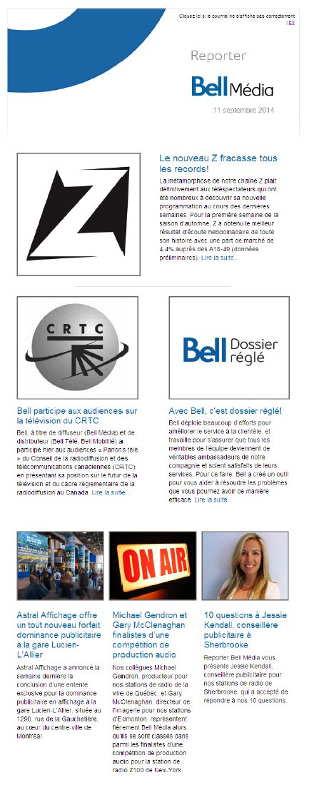 Entry Highlights: View Competition Class Performance | Company Name: | Bell Media  | | Company Web Site: | www.bellmedia.ca | | Project Name: | "Bell Media Reporter" | | Competition Category: | Digital: Newsletter/Magazine | | Annual Revenue: | $1 - $10 billion | | Employee Base: | 1,000 - 10,000 Employees | | Award Garnered: | Gold | | Top 100 Rank: | 36 | | | | Judging Results | | First Impression: | | | Overall Narrative: | | | Overall Visual Design: | | | Creativity: | | | Message Clarity: | | | Perceived Relevance: | | | Total Score: | |
