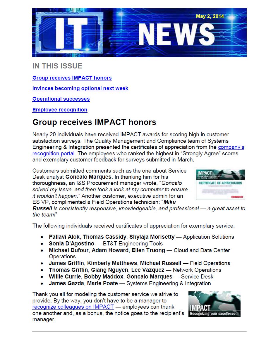Entry Highlights: View Competition Class Performance | Company Name: | BAE Systems, Inc.  | | Company Web Site: | tiny.cc/BAE-Systems-Inc | | Project Name: | "Creating an Engaging Newsletter" | | Competition Category: | Digital: Newsletter/Magazine | | Annual Revenue: | $1 - $10 billion | | Employee Base: | 10,000+ Employees | | Award Garnered: | Silver | | | | Judging Results | | First Impression: | | | Overall Narrative: | | | Overall Visual Design: | | | Creativity: | | | Message Clarity: | | | Perceived Relevance: | | | Total Score: | |