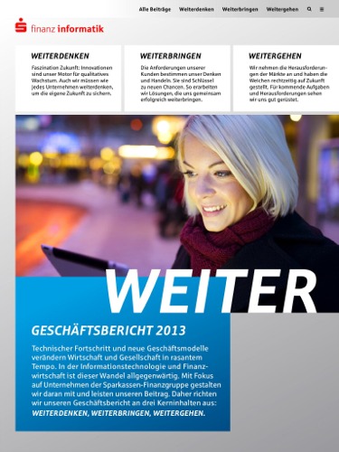 Entry Highlights: View Competition Class Performance | Company/Agency Name: | Finanz Informatik  / beierarbeit | | Company/Agency Web Site: | www.f-i.de / www.beierarbeit.de | | Project Name: | "FI-Geschäftsbericht 2013" | | Competition Category: | Digital: iPad App | | Annual Revenue: | $100 million - $1 billion | | Employee Base: | 1,000 - 10,000 Employees | | Award Garnered: | Silver | | Top 100 Rank: | 75 | | | | Judging Results | | First Impression: | | | Overall Narrative: | | | Overall Visual Design: | | | Creativity: | | | Message Clarity: | | | Perceived Relevance: | | | Total Score: | |