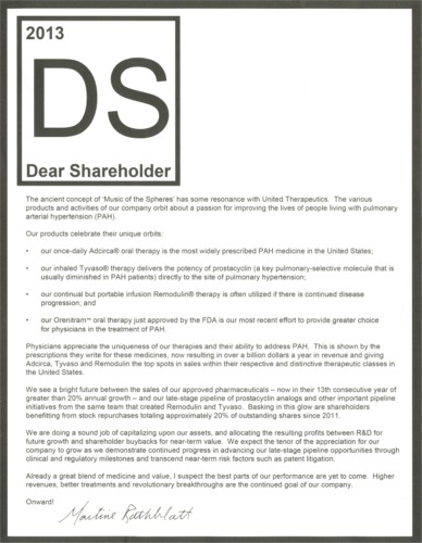 Entry Highlights: View Competition Class Performance | Company Name: | United Therapeutics  | | Company Web Site: | www.unither.com | | Project Name: | "Periodic Tablecloth of UT Elements" | | Competition Category: | Print: Annual Report | | Annual Revenue: | $1 - $10 billion | | Employee Base: | 100 - 1,000 Employees | | Award Garnered: | Platinum | | Top 100 Rank: | 2 | | | | Judging Results | | First Impression: | | | Overall Narrative: | | | Overall Visual Design: | | | Creativity: | | | Message Clarity: | | | Perceived Relevance: | | | Total Score: | |