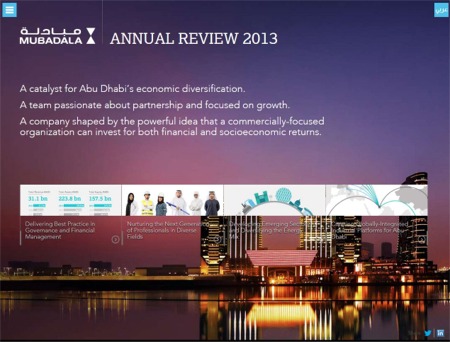 Entry Highlights: View Competition Class Performance | Company/Agency Name: | Mubadala Development Company  / Emperor | | Company/Agency Web Site: | www.mubadala.com / www.emperordesign.co.uk | | Project Name: | The Mubadala Development Company Annual Review | | Competition Category: | Digital: Multimedia/Interactive | | Annual Revenue: | $10+ billion | | Employee Base: | 1,000 - 10,000 Employees | | Award Garnered: | Bronze | | | | Judging Results | | First Impression: | | | Overall Narrative: | | | Overall Visual Design: | | | Creativity: | | | Message Clarity: | | | Perceived Relevance: | | | Total Score: | |