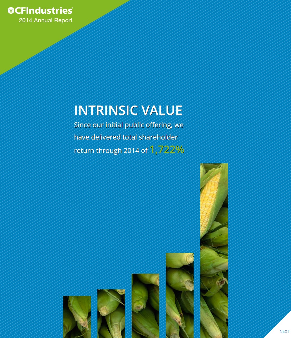 | Company/Agency Name: | CF Industries / Corporate Reports Inc | | Company/Agency Web Site: | www.cfindustries.com/ / www.corporatereport.com | | Annual Revenue: | $1 - $10 billion | | Employee Base: | 1,000 - 10,000 employees | | Core Industry: | Agribusiness | | Type of Report: | Digital / Online Report | | Title/Theme: | CF Industries 2014 Annual Report - Intrinsic Value | | Regional Top 80 Rank: | 33 (Americas Region) | | Country-Based Honors: | Top 40 American Reports | | Industry Award Garnered: | Gold | | Top 100 Worldwide Rank: | | | | | Judging Results | | First Impression: | | | Report Cover: | | | Letter to Shareholders: | | | Report Narrative: | | | Report Financials: | | | Creativity: | | | Message Clarity: | | | Information Accessibility: | | | Total Score: | |