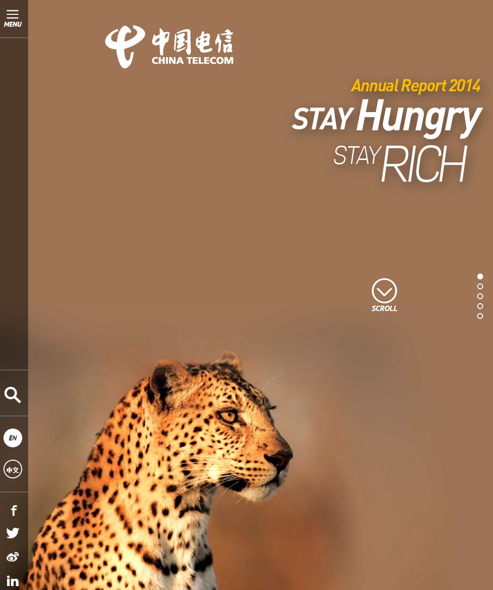| Company Name: | China Telecom Corporation Limited  | | Company Web Site: | ar2014.chinatelecom-h.com | | Annual Revenue: | $10+ billion | | Employee Base: | 10,000+ Employees | | Core Industry: | Telecommunications | | Type of Report: | Digital / Online Report | | Title/Theme: | "STAY HUNGRY, STAY RICH" | | Industry Award Garnered: | Bronze | | Top 100 Worldwide Rank: | | | | | Judging Results | | First Impression: | | | Report Cover: | | | Letter to Shareholders: | | | Report Narrative: | | | Report Financials: | | | Creativity: | | | Message Clarity: | | | Information Accessibility: | | | Total Score: | |