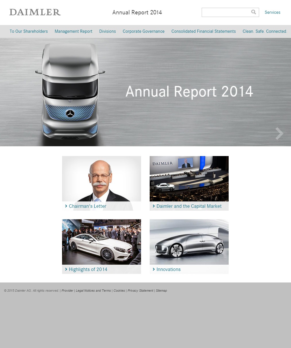 | Company/Agency Name: | Daimler AG / NetFederation GmbH | | Company/Agency Web Site: | www.daimler.com / www.net-federation.de | | Annual Revenue: | $10+ billion | | Employee Base: | 10,000+ employees | | Core Industry: | Automobiles & Components | | Type of Report: | Digital / Online Report | | Title/Theme: | Clean. Safe. Connected. | | Industry Award Garnered: | Gold | | Top 100 Worldwide Rank: | | | | | Judging Results | | First Impression: | | | Report Cover: | | | Letter to Shareholders: | | | Report Narrative: | | | Report Financials: | | | Creativity: | | | Message Clarity: | | | Information Accessibility: | | | Total Score: | |
