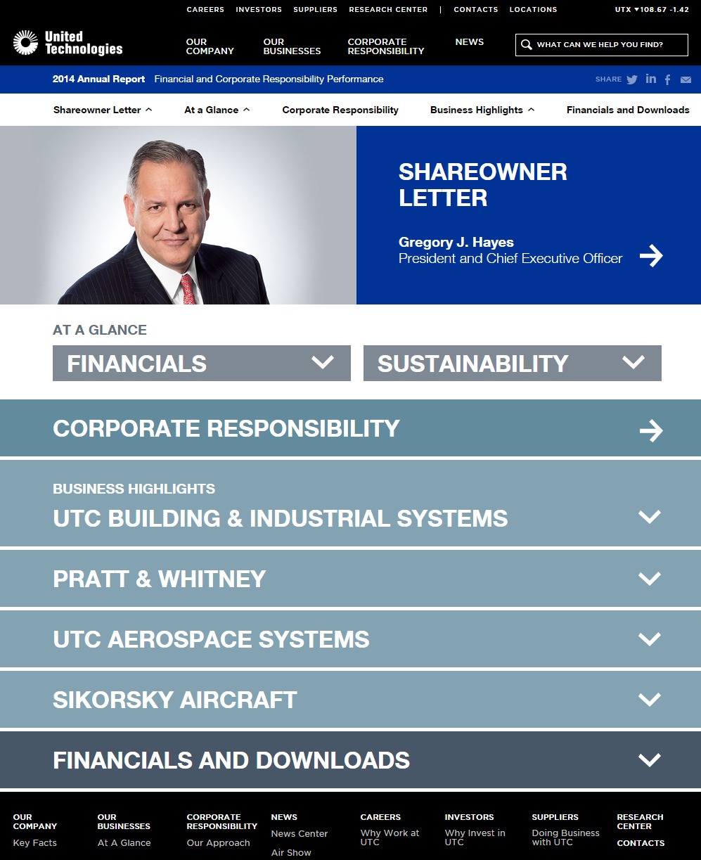 | Company/Agency Name: | United Technologies / Ideas On Purpose | | Company/Agency Web Site: | 2014ar.utc.com / www.ideasonpurpose.com | | Annual Revenue: | $10+ billion | | Employee Base: | 10,000+ Employees | | Core Industry: | Conglomerates, Holding Cos., Divers. Invest. | | Type of Report: | Digital / Online Report | | Regional Top 80 Rank: | 11 (Americas Region) | | Country-Based Honors: | Top 40 American Reports | | Industry Award Garnered: | Platinum | | Top 100 Worldwide Rank: | 50 | | | | Judging Results | | First Impression: | | | Report Cover: | | | Letter to Shareholders: | | | Report Narrative: | | | Report Financials: | | | Creativity: | | | Message Clarity: | | | Information Accessibility: | | | Total Score: | |