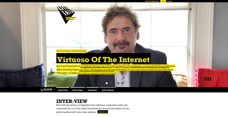 | Company Name: | grasundsterne GmbH  | | Company Web Site: | www.grasundsterne.de | | Annual Revenue: | Up to $10 million | | Employee Base: | Up to 100 Employees | | Publication/Project Name: | "Digtator" | | Publication Format: | Web/Electronic | Bi-Monthly | | Primary Audience: | Marketing Decision-Makers | | Award Garnered: | Gold | | | | | Judging Results | | First Impression: | | | Artwork: | | | Readability: | | | Creativity: | | | Message Clarity: | | | Variety of Features: | | | Audience Focus: | | | Perceived Relevance: | | | Ease of Navigation: | | | Total Score: | |