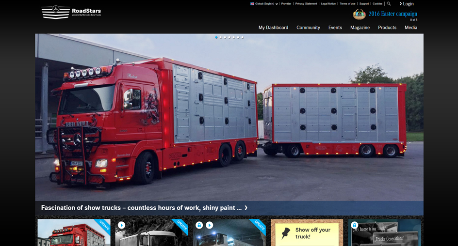 | Company/Agency Name: | Mercedes-Benz  / mensemedia Gesellschaft für Neue Medien mbH / PRH Hamburg Kommunikation GmbH | | Annual Revenue: | Up to $10 million | | Employee Base: | Up to 100 employees | | Publication/Project Name: | "RoadStars powered by Mercedes-Benz Trucks" | | Publication Format: | Web/Electronic | Daily | | Primary Audience: | Community | | Award Garnered: | Platinum | | | | | Judging Results | | First Impression: | | | Artwork: | | | Readability: | | | Creativity: | | | Message Clarity: | | | Variety of Features: | | | Audience Focus: | | | Perceived Relevance: | | | Ease of Navigation: | | | Total Score: | |