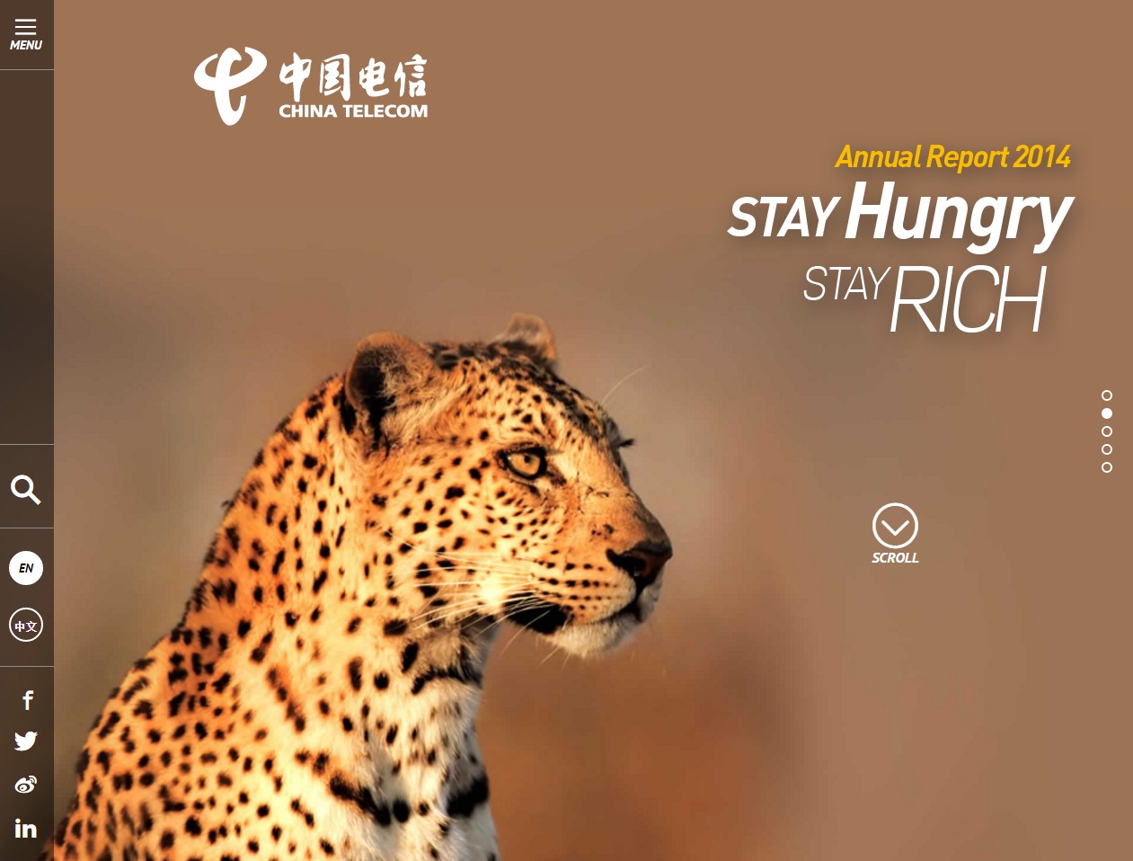Entry Highlights: View Competition Class Performance | Company Name: | China Telecom Corporation Limited  | | Company Web Site: | ar2014.chinatelecom-h.com | | Project Name: | The China Telecom Online Annual Report | | Competition Category: | Digital: Multimedia/Interactive | | Annual Revenue: | $10+ billion | | Employee Base: | 10,000+ Employees | | Award Garnered: | Gold | | Top 100 Rank: | 32 | | | | Judging Results | | First Impression: | | | Overall Narrative: | | | Overall Visual Design: | | | Creativity: | | | Message Clarity: | | | Perceived Relevance: | | | Total Score: | |