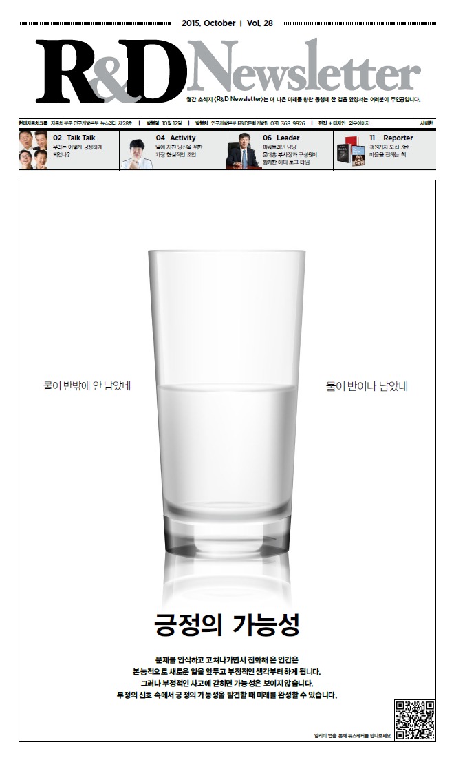 Entry Highlights: View Competition Class Performance | Company/Agency Name: | HYUNDAI MOTOR COMPANY  / WOW IMAGE | | Company Web Site: | www.hyundai.com | | Project Name: | "R&D Newsletter" | | Competition Category: | Print: Magazine/Newsletter | | Annual Revenue: | $10+ billion | | Employee Base: | 10,000+ employees | | Award Garnered: | Gold | | Top 100 Rank: | 46 | | | | Judging Results | | First Impression: | | | Overall Narrative: | | | Overall Visual Design: | | | Creativity: | | | Message Clarity: | | | Perceived Relevance: | | | Total Score: | |