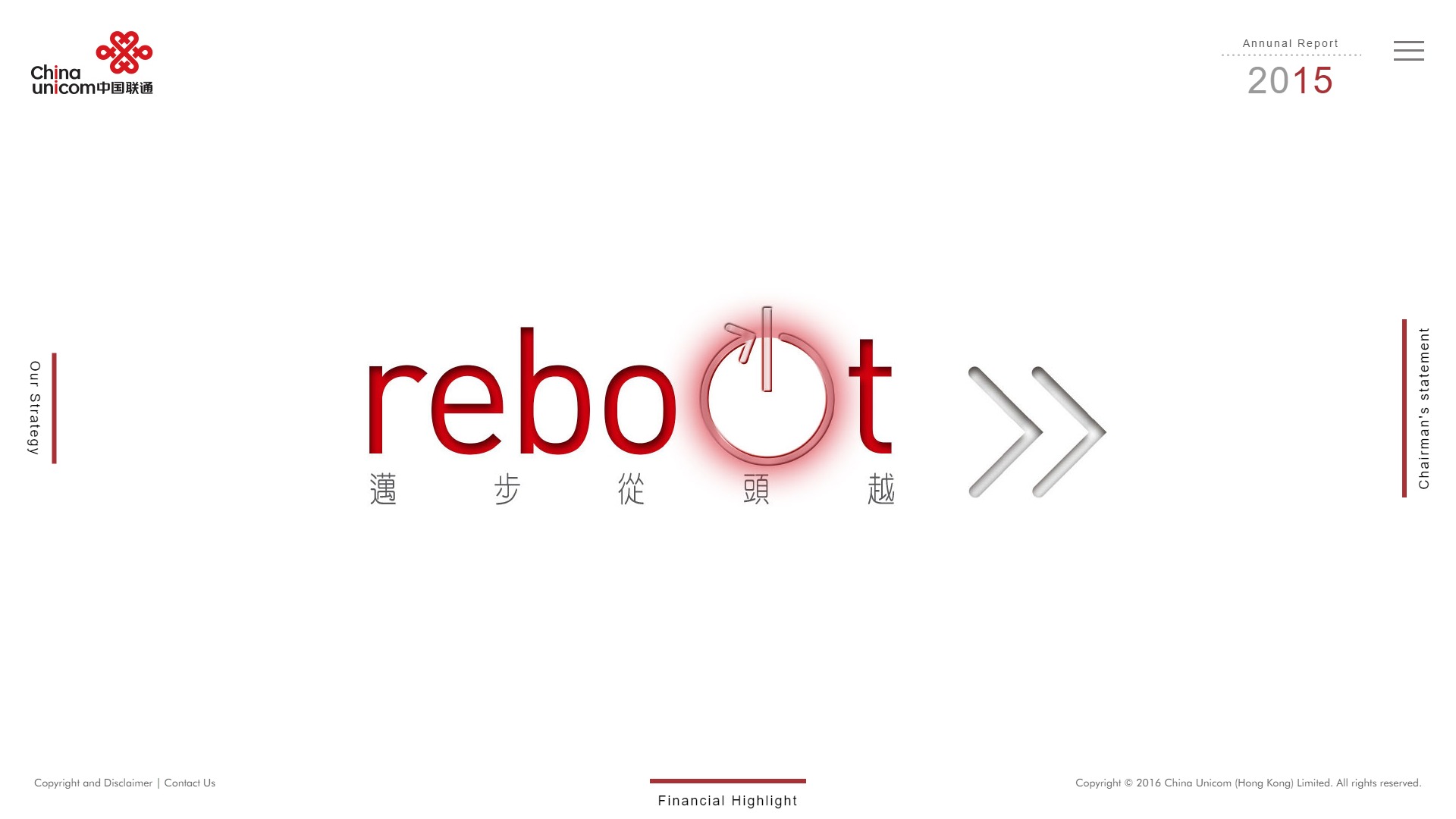 | Company/Agency Name: | China Unicom (Hong Kong) Limited / EQS Group AG | | Company/Agency Web Site: | www.chinaunicom.com.hk/ / www.eqs.com | | Annual Revenue: | $10+ billion | | Employee Base: | 10,000+ employees | | Core Industry: | Retailing — Internet/Catalog | | Type of Report: | Online Report | | Title/Theme: | "reboot" | | Regional Top 80 Rank: | 3 (Asia-Pacific Region) | | Country-Based Honors: | Top 50 Chinese Reports | | Industry Award Garnered: | Platinum | | Top 100 Worldwide Rank: | 10 | | | | Judging Results | | First Impression: | | | Report Cover: | | | Letter to Shareholders: | | | Report Narrative: | | | Report Financials: | | | Creativity: | | | Message Clarity: | | | Information Accessibility: | | | Total Score: | |