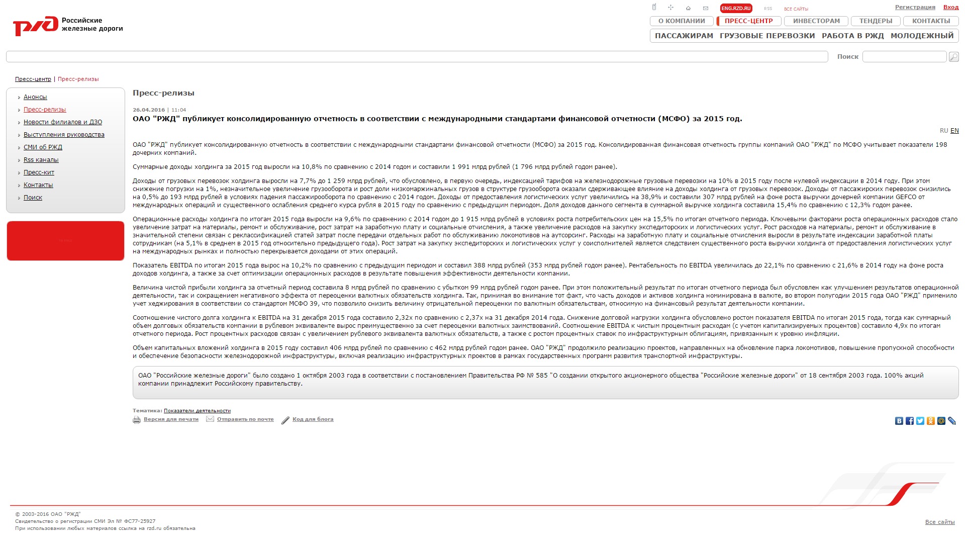 | Company/Agency Name: | Russian Railways / Zebra B2B Design Bureau | | Company/Agency Web Site: | eng.rzd.ru/ / www.zebra-group.ru | | Annual Revenue: | $10+ billion | | Employee Base: | 10,000+ employees | | Core Industry: | Transportation & Logistics | | Type of Report: | Online Report | | Title/Theme: | On the Path to Change | | Regional Top 80 Rank: | 73 (Europe/Middle East/Africa Region) | Industry Award Garnered: Silver | Top 100 Worldwide Rank: | | | | | Judging Results | | First Impression: | | | Report Cover: | | | Letter to Shareholders: | | | Report Narrative: | | | Report Financials: | | | Creativity: | | | Message Clarity: | | | Information Accessibility: | | | Total Score: | |