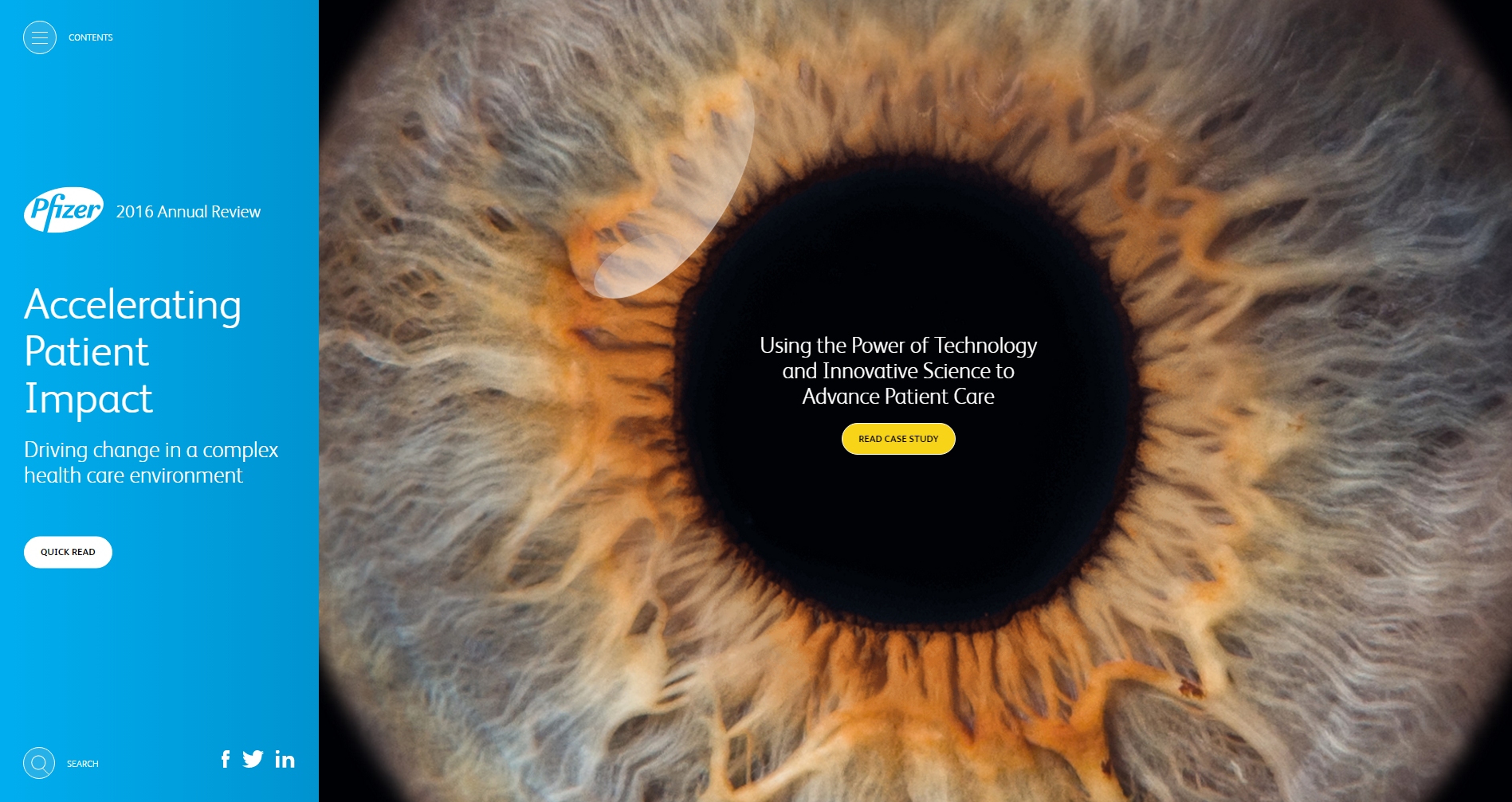 | Company/Agency Name: | Pfizer / GCI Health | | Company/Agency Web Site: | www.pfizer.com/files/investors/financial_reports/annual_reports/2016/index.html / gcihealth.com/ | | Annual Revenue: | $10+ billion | | Employee Base: | 10,000+ employees | | Core Industry: | Pharmaceuticals | | Type of Report: | Integrated Report | | Title/Theme: | "Accelerating Patient Impact Driving change in a complex health care environment" | | Industry Award Garnered: | Silver | | | | Judging Results | | First Impression: | | | Report Cover: | | | Letter to Shareholders: | | | Report Narrative: | | | Report Financials: | | | Creativity: | | | Message Clarity: | | | Information Accessibility: | | | Total Score: | |