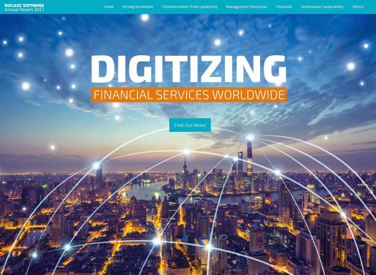 | Company Name: | Nucleus Software Exports Limited  | | Company Web Site: | www.nucleussoftware.com/ | | Annual Revenue: | $10 - $100 million | | Employee Base: | 1,000 - 10,000 employees | | Core Industry: | Technology — Software | | Type of Report: | Online / Digital Report | | Title/Theme: | DIGITIZING FINANCIAL SERVICES WORLDWIDE | | Industry Award Garnered: | Platinum | | Top 100 Worldwide Rank: | 7 | | | | Judging Results | | First Impression: | | | Report Cover: | | | Letter to Shareholders: | | | Report Narrative: | | | Report Financials: | | | Creativity: | | | Message Clarity: | | | Information Accessibility: | | | Total Score: | |