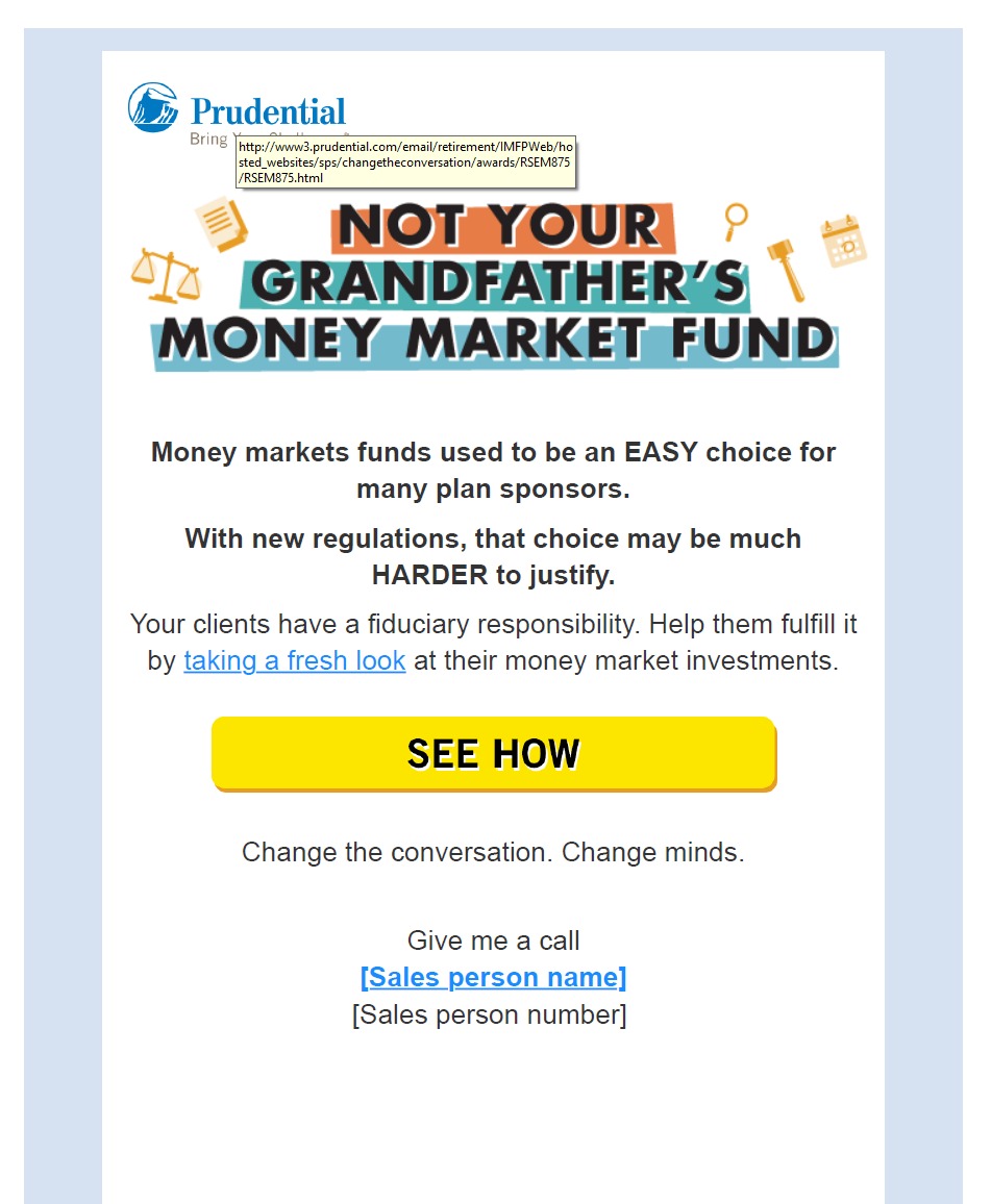 Entry Highlights: View Competition Class Performance | Company Name: | Prudential   | | Company Ticker Symbol: | Yes | | Project Name: | Prudential Retirement Change the Conversation 2016 Communications Campaign | | Competition Category: | Digital: Multimedia/Interactive | | Annual Revenue: | $10+ billion | | Employee Base: | 10,000+ employees | | Award Garnered: | Gold | | Top 100 Rank: | 42 | | | | Judging Results | | First Impression: | | | Overall Narrative: | | | Overall Visual Design: | | | Creativity: | | | Message Clarity: | | | Perceived Relevance: | | | Total Score: | |