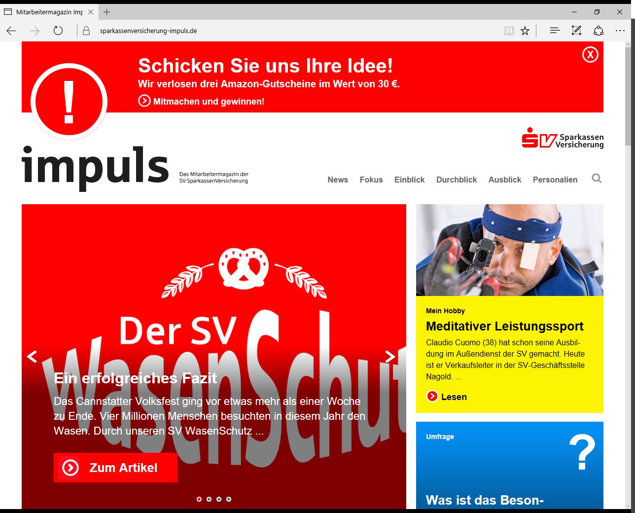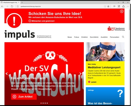 Entry Highlights: View Competition Class Performance | Company/Agency Name: | SV SparkassenVersicherung  / SIGNUM communication Werbeagentur GmbH | | Company/Agency Web Site: | www.sparkassenversicherung.de / www.signum-web.de | | Company Ticker Symbol: | No | | Project Name: | "impuls – Das Mitarbeitermagazin der SV Sparkassen Versicherung" | | Competition Category: | Digital: Web/Intranet Site (List Under 'Special Instructions') | | Annual Revenue: | $100 million - $1 billion | | Employee Base: | 1,000 - 10,000 Employees | | Award Garnered: | Bronze | | | | Judging Results | | First Impression: | | | Overall Narrative: | | | Overall Visual Design: | | | Creativity: | | | Message Clarity: | | | Perceived Relevance: | | | Total Score: | |