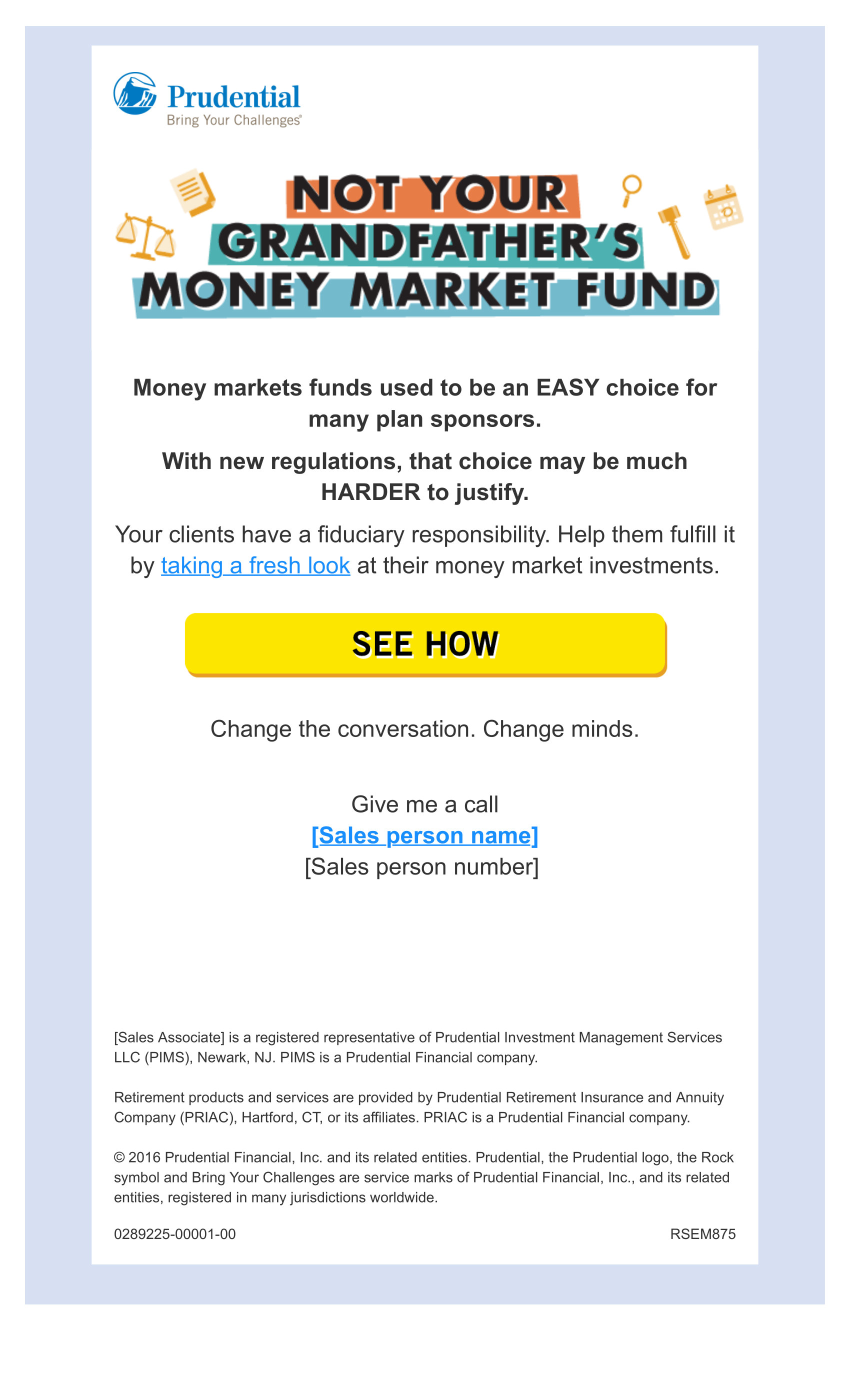 Entry Highlights: View Competition Class Performance | Company Name: | Prudential   | | Company Ticker Symbol: | Yes | | Project Name: | Prudential Retirement Change the Conversation 2016 Communications Campaign | | Competition Category: | Multiple/Mixed Formats: Communications Campaign | | Annual Revenue: | $10+ billion | | Employee Base: | 10,000+ employees | | Award Garnered: | Platinum | | Top 100 Rank: | 16 | | | | Judging Results | | First Impression: | | | Overall Narrative: | | | Overall Visual Design: | | | Creativity: | | | Message Clarity: | | | Perceived Relevance: | | | Total Score: | |