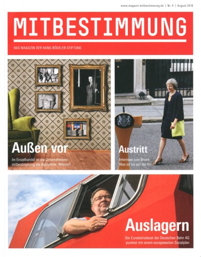 Entry Highlights: View Competition Class Performance | Company/Agency Name: | Hans-Boeckler-Stiftung  / SIGNUM communication Werbeagentur GmbH | | Company/Agency Web Site: | www.boeckler.de / www.signum-web.de | | Company Ticker Symbol: | No | | Project Name: | "Mitbestimmung – Das Magazin der Hans-Boeckler-Stiftung" (Ausbgabe 4/2016) | | Competition Category: | Print: Magazine/Newsletter | | Annual Revenue: | $10 - $100 million | | Employee Base: | 100 - 1,000 Employees | | Award Garnered: | Bronze | | | | Judging Results | | First Impression: | | | Overall Narrative: | | | Overall Visual Design: | | | Creativity: | | | Message Clarity: | | | Perceived Relevance: | | | Total Score: | |