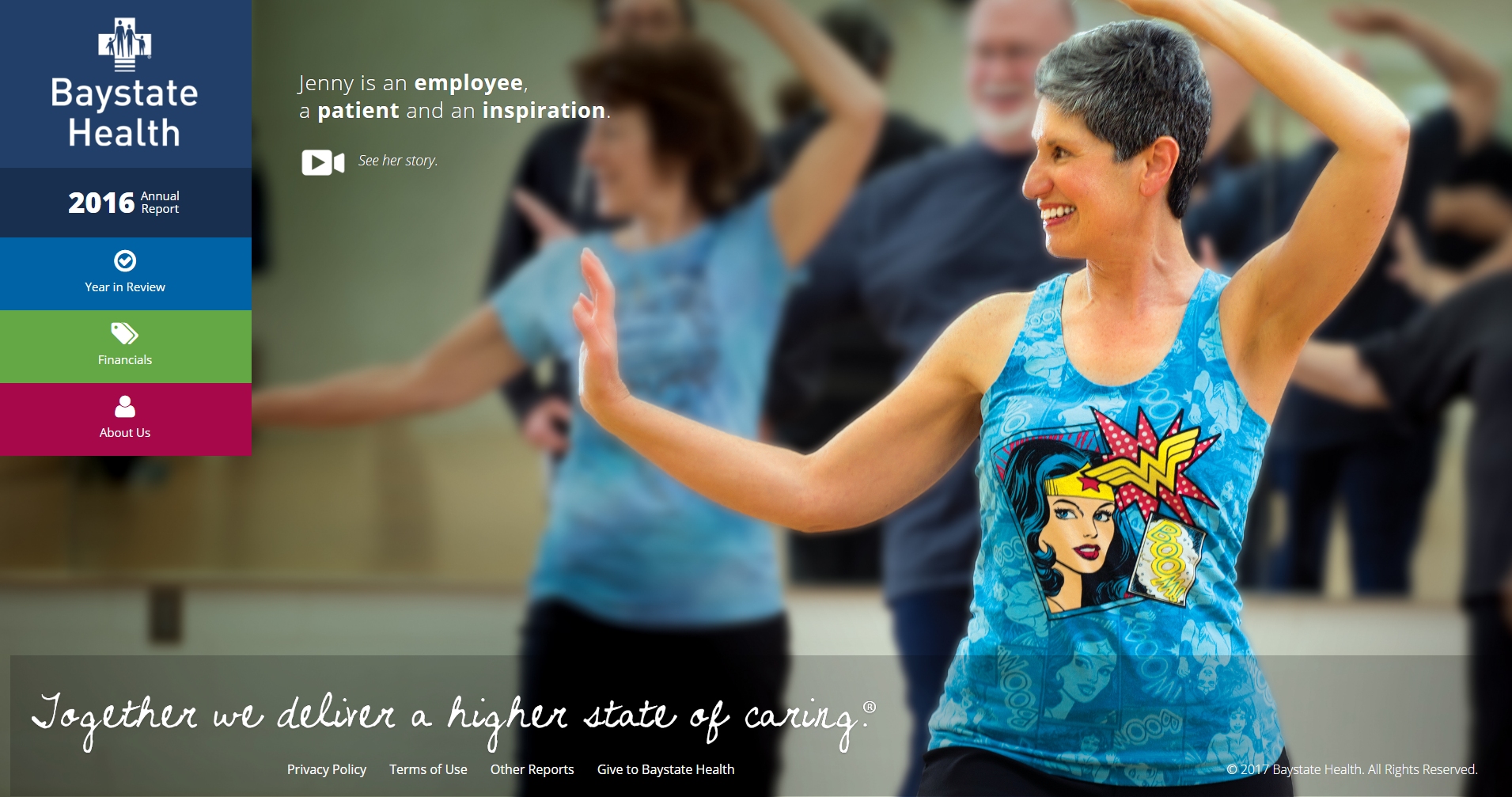 | Company/Agency Name: | Baystate Health / Gravity Switch | | Company/Agency Web Site: | www.baystatehealth.org / www.gravityswitch.com | | Annual Revenue: | $1 - $10 billion | | Employee Base: | 10,000+ employees | | Core Industry: | Health Care — Providers & Services | | Type of Report: | Digital Report | | Regional Top 80 Rank: | 18 (Americas Region) | | Country-Based Honors: | Top 50 American Reports | | Industry Award Garnered: | Platinum | | Top 100 Worldwide Rank: | 45 | | | | Judging Results | | First Impression: | | | Report Cover: | | | Letter to Shareholders: | | | Report Narrative: | | | Report Financials: | | | Creativity: | | | Message Clarity: | | | Information Accessibility: | | | Total Score: | |